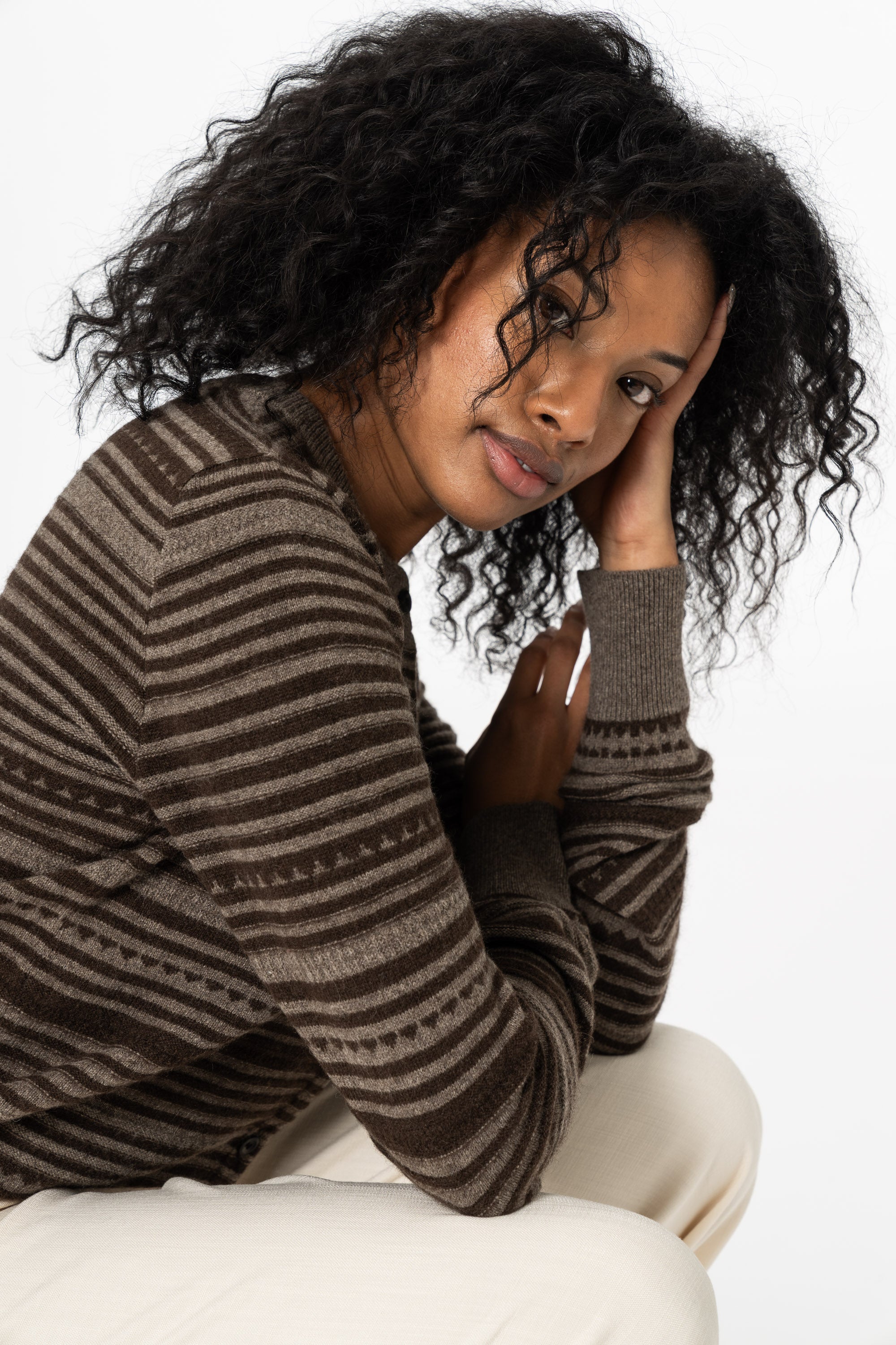 A fitted, round neck cardigan featuring irregular knitted stripes, horn buttons and ribbed cuffs. Knitted in undyed luxuriously soft yak wool.