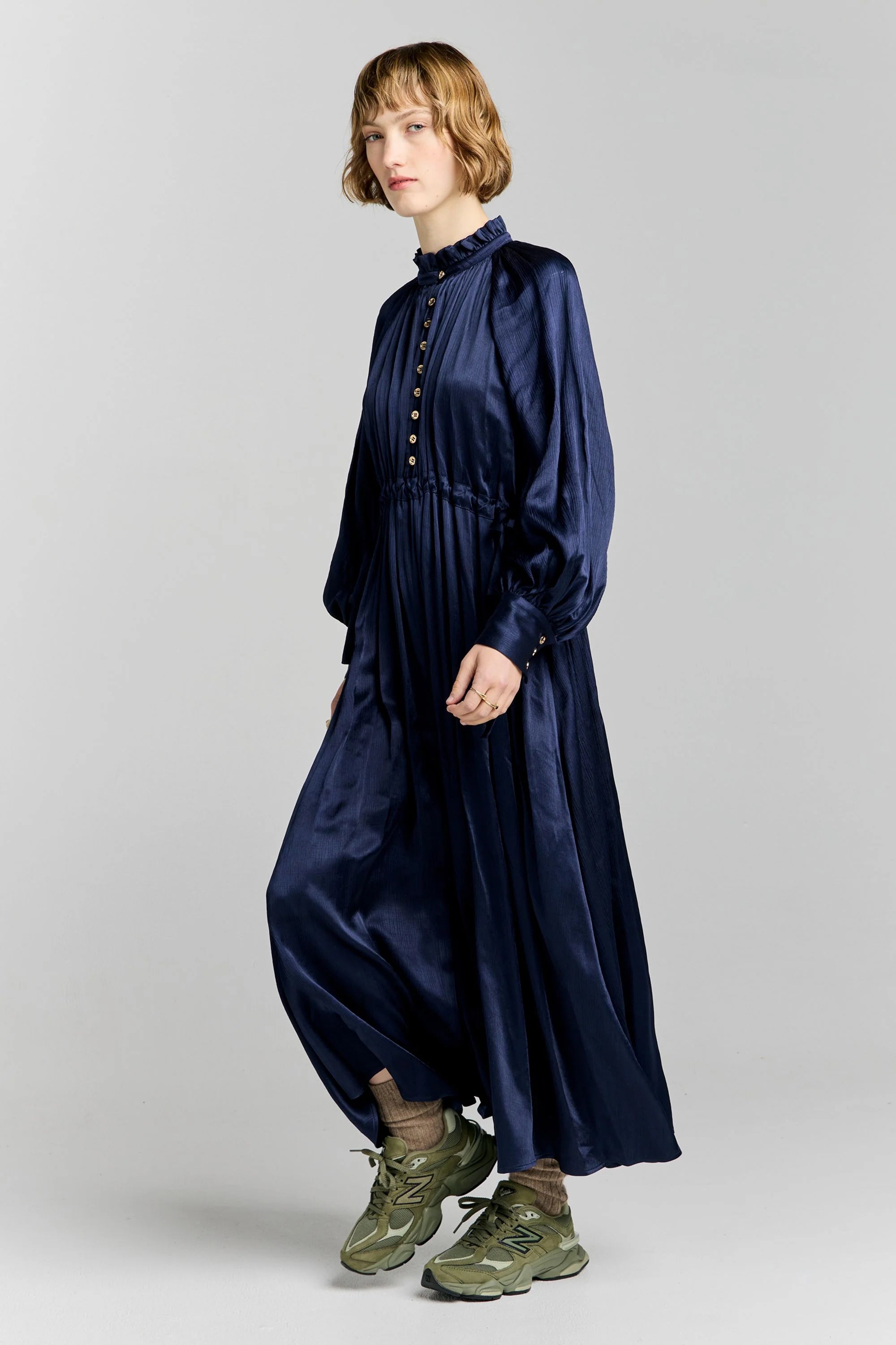 The Deluge Dress brings floor-grazing elegance in luminous crinkle satin. With a long, flowing silhouette that drapes beautifully, this dress moves gracefully with every step. Understated detailing allows the fabric’s natural sheen and texture to shine, making it the perfect option for occasions where ease and polish are equally important.