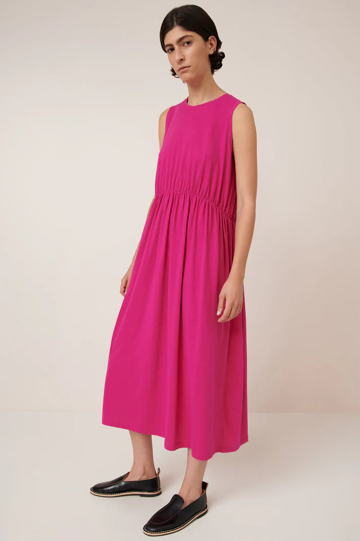 An effortless summer staple, the Light Curve Dress is designed with a relaxed, off-the-body fit for all day comfort. Featuring an elasticated gathered waist, it falls to a flattering midi-length. Made in a lightweight organic cotton jersey in a vibrant Magenta.
