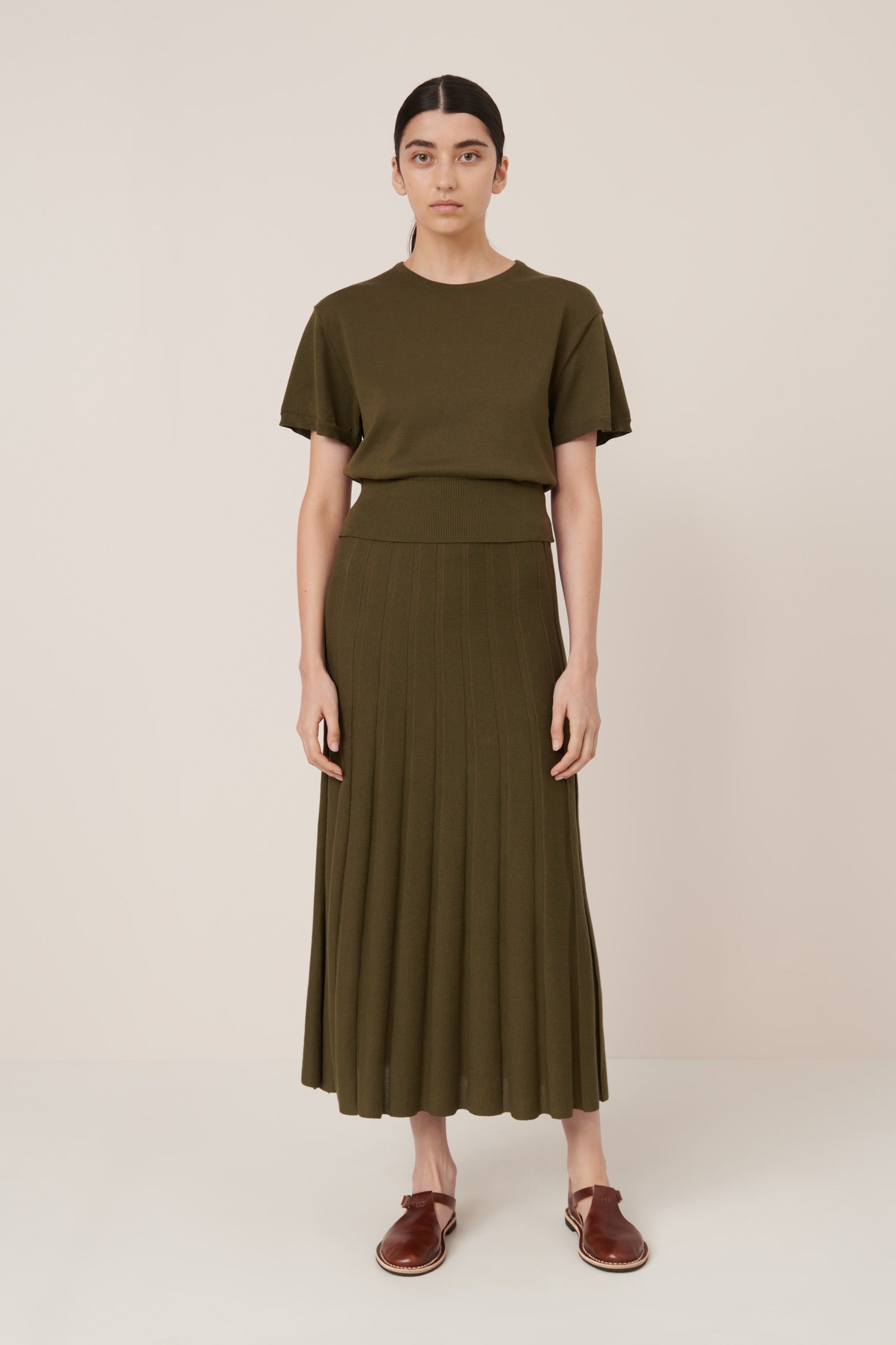 The Silhouette Top features a standard fit with dropped shoulders, a crew neck and displaced shoulder seams. A fitted ribbed hem band cinches the waist, creating a cropped length and adding a sculptural touch. Crafted from organic cotton and knit in a fine single jersey stitch. All Fairtrade organic cotton. All plastic-free.