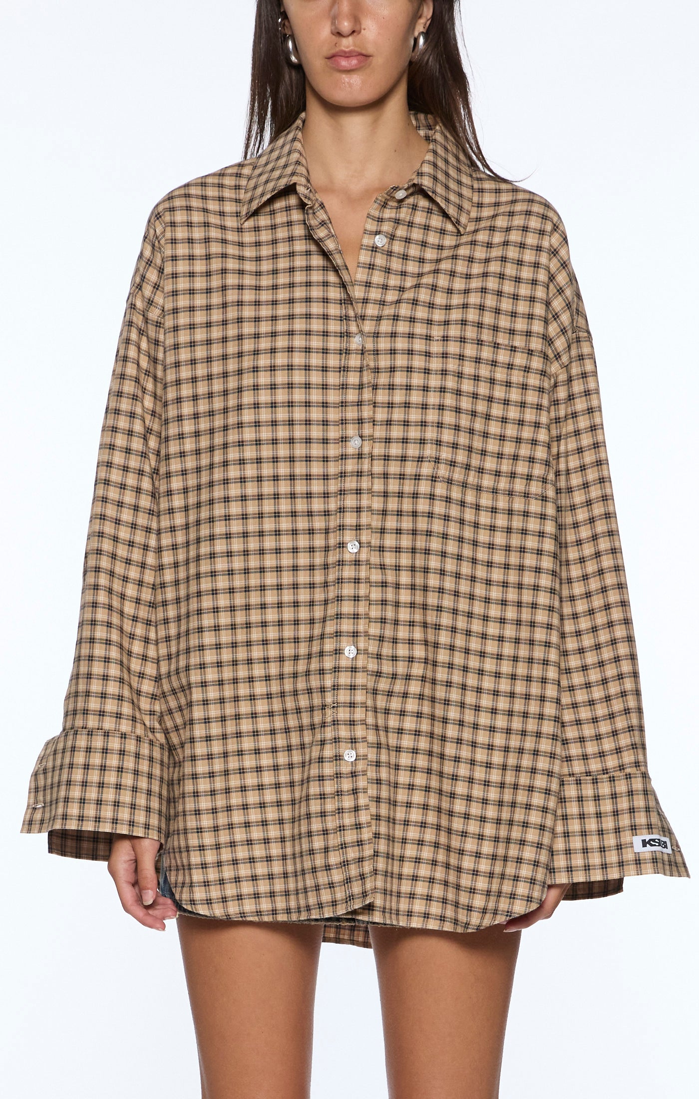 The Astra Ls Shirt Tan Plaid is an oversized button-up shirt made from premium European 100% organic cotton in a tan plaid colourway. Featuring a patch pocket, curved hem, classic center front collar and exaggerated cuffs, it's finished with a 'SOTT' woven label on the cuff and Ksubi T-box embroidery. Style back with any Ksubi denim for an off-duty elevated look.