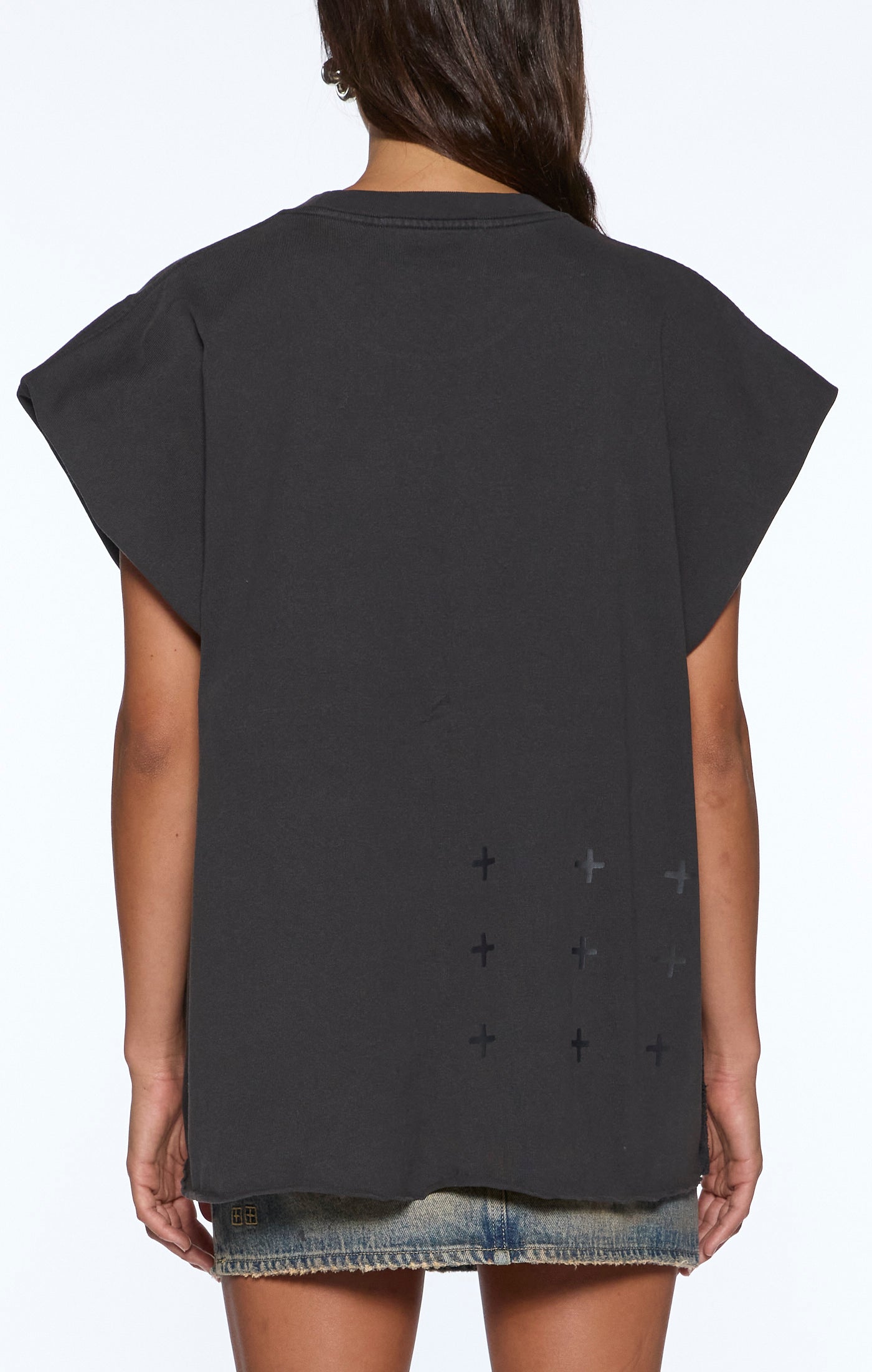 The Ksuper Tee is our boxiest and heaviest tee yet, crafted from premium (K)super heavyweight cotton jersey with a dry hand-feel in a 'Washed Black' colorway featuring a vintage, worn-in wash. Designed with a boxy silhouette, dropped shoulders, and cut-off cap sleeves, the heavyweight fabric creates a structured look at the shoulders. It's finished with an oxidized black Ksubi plaque and signature T-box embroidery.