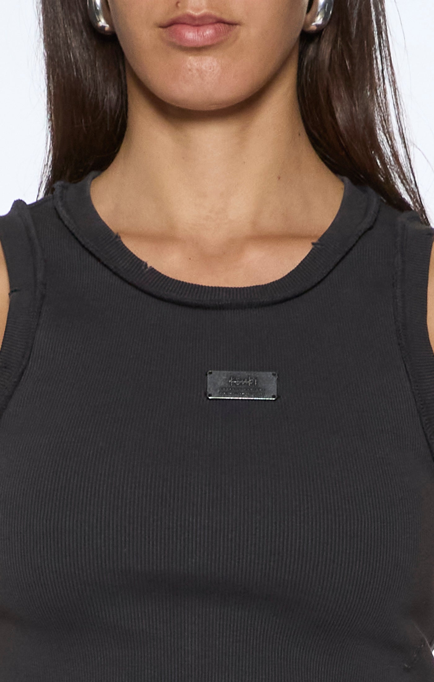 A scoop-neck fitted tank top in 'Charcoal' colorway, featuring a racerback design and a regular length. Crafted from premium midweight ribbed fabric with a smooth, dry hand feel. Finished with Oxidised Black Ksubi metal plaque on front chest and signature T-box embroidery
