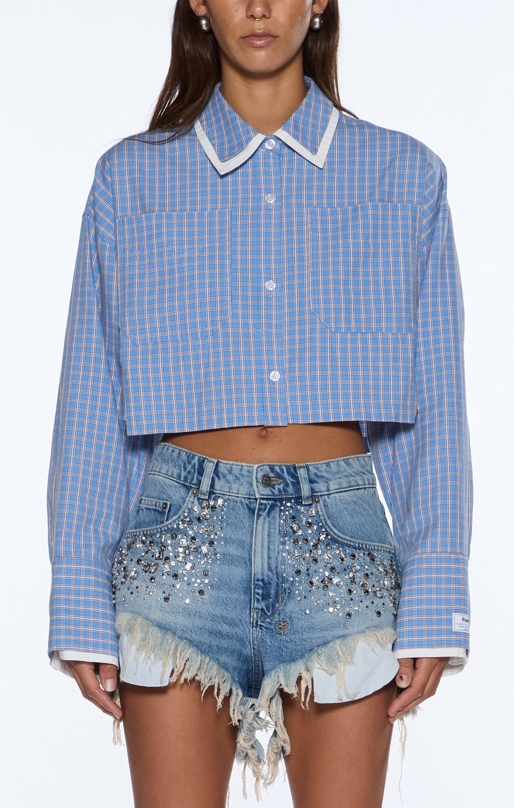 The Balter LS Shirt Blu Check is an oversized button-up shirt crafted from premium 100% cotton in a custom handloom plaid with a seasonal blue check. Designed with a cropped length, contrast double-layer collar and cuffs, panelled twin patch pockets, and exaggerated cuffs, it is finished with a 'Made in Heaven' woven label on the cuff and Ksubi's signature T-box embroidery for an elevated off-duty look.