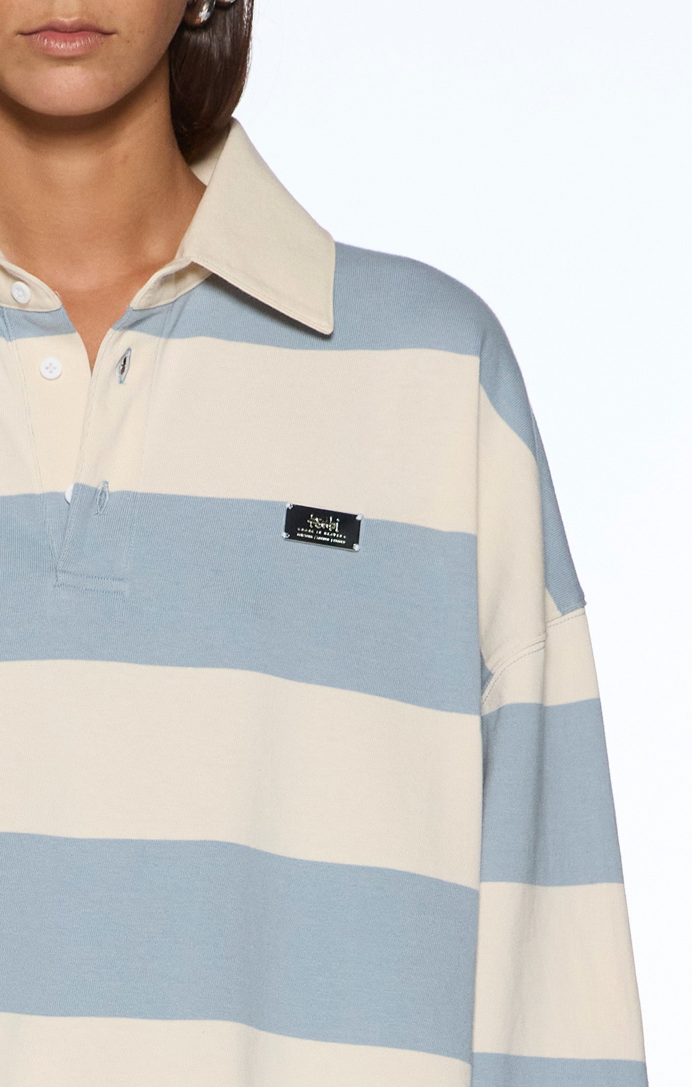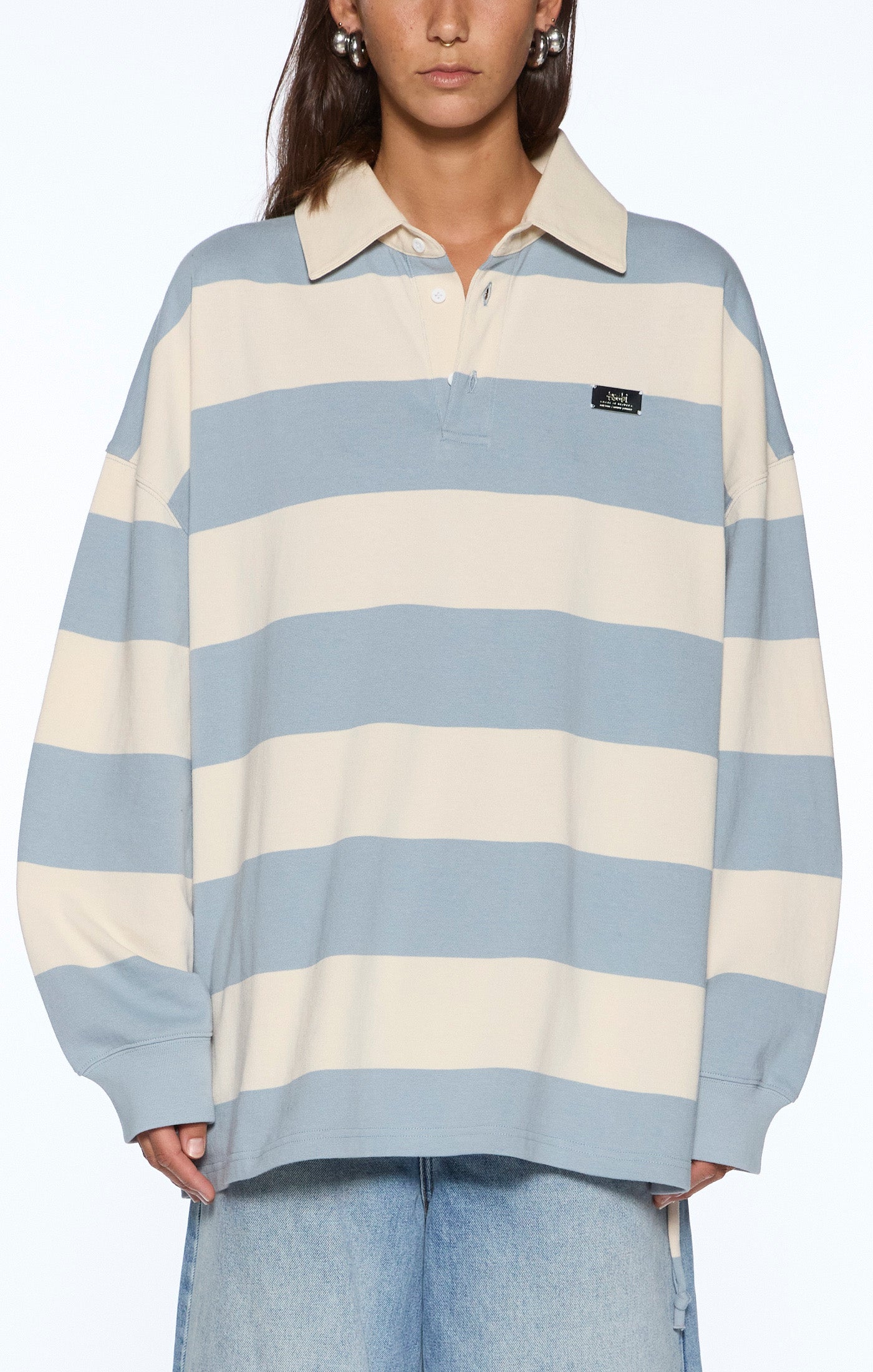 This oversized rugby jersey features dropped shoulders for a relaxed, borrowed-from-the-boys vibe. Classic rugby details include bold stripes, a white point collar, a concealed placket, and rib-knit cuffs. Crafted from heavyweight cotton jersey, it's finished with a shiny silver Ksubi metal plaque and signature T-box embroidery.