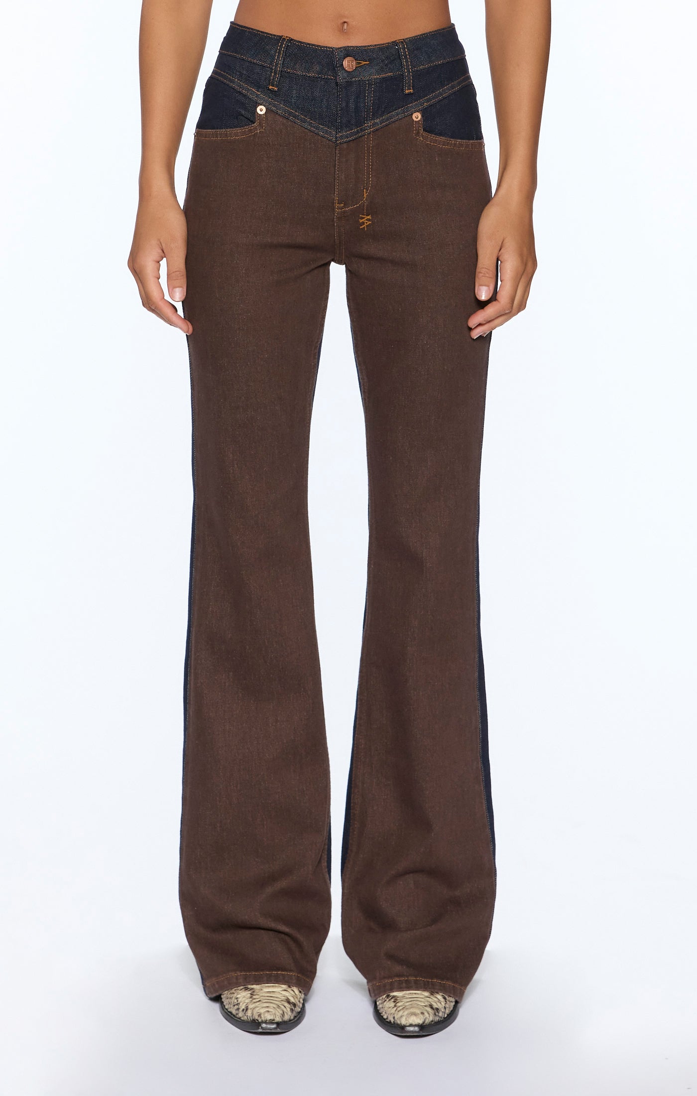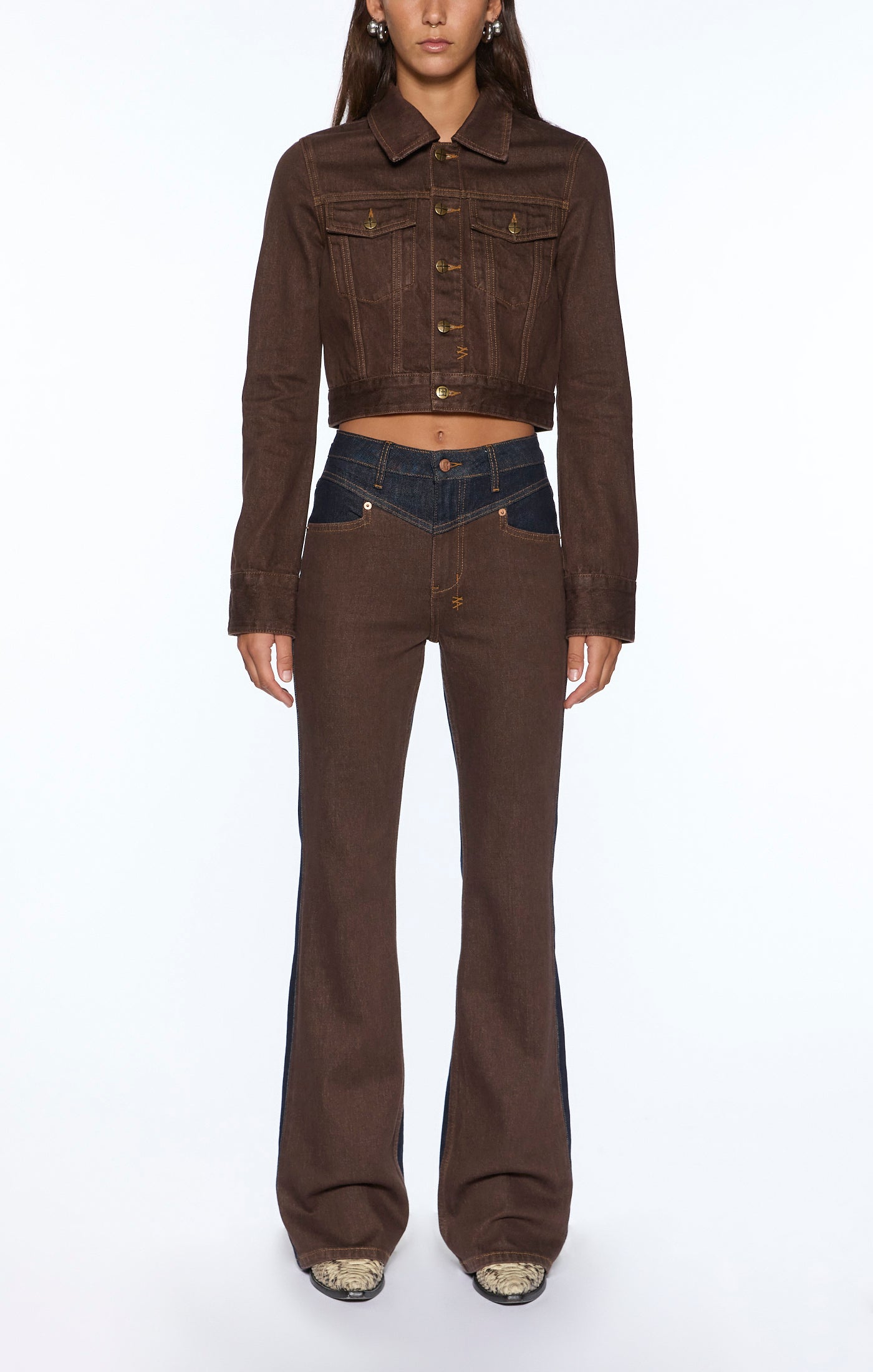 Full-length mid rise bootcut jean. Made from a premium raw rinse comfort stretch denim spliced with brown overdyed denim. It features classic five-pocket styling, Ksubi branded anti-brass hardware and T-box and 3x4 embroidery, with removeable pocket tag on the back pocket. Style back with Slim Trucker Saddle Brown.