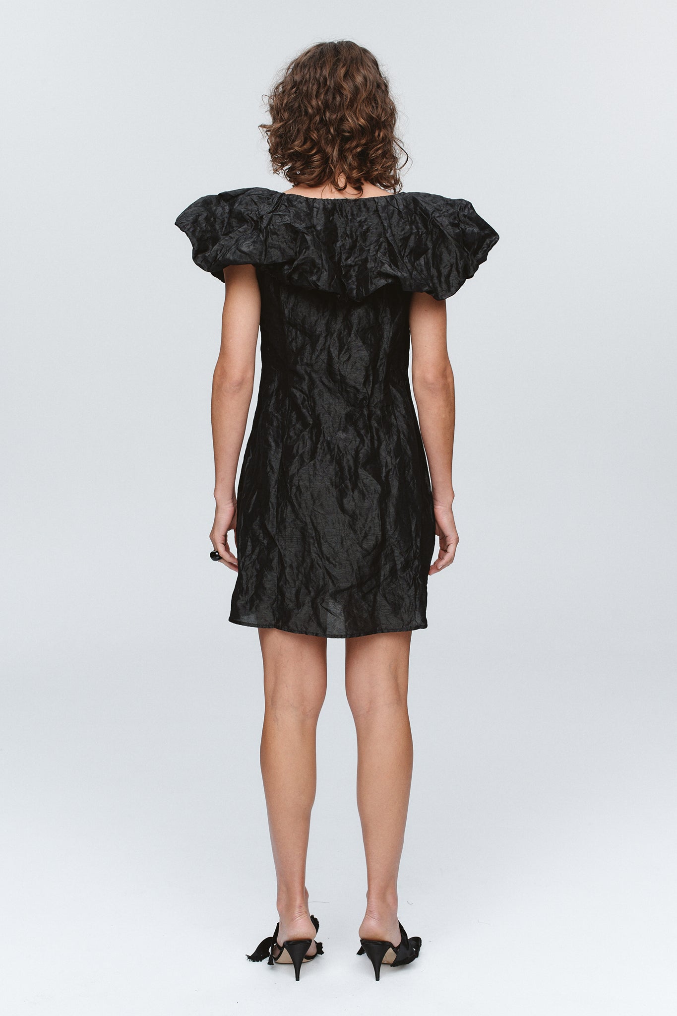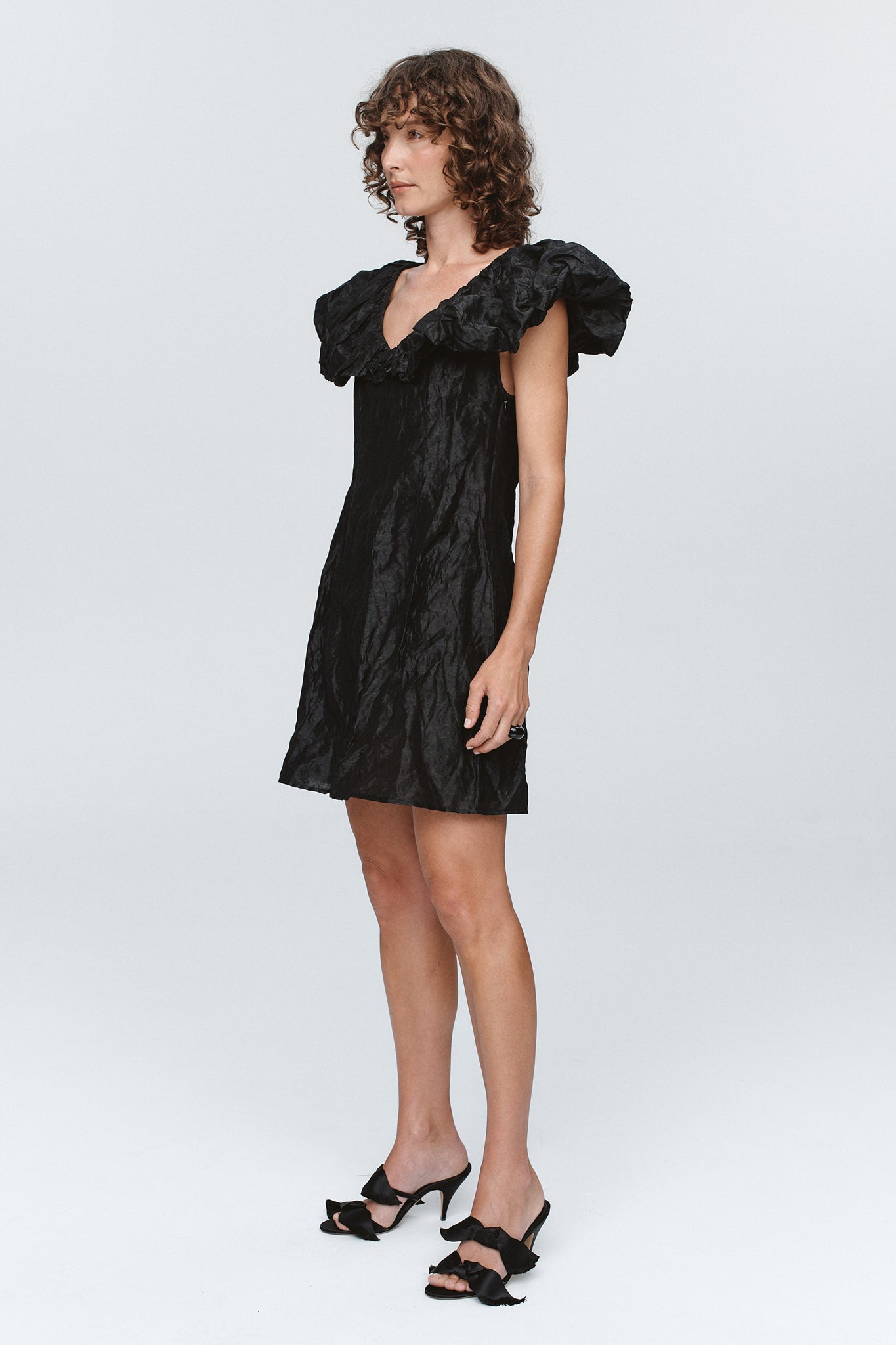 A sleeveless top constructed from a textured cotton / silk / metal fabric with a permanent crinkled finish. Cut with a fitted bodice and shaped seams for contouring. Features a wide, sculptural ruffle collar extending from the neckline and draping over the shoulders, creating soft volume and dimensional structure. Finished with a deep V-neckline and clean hem.