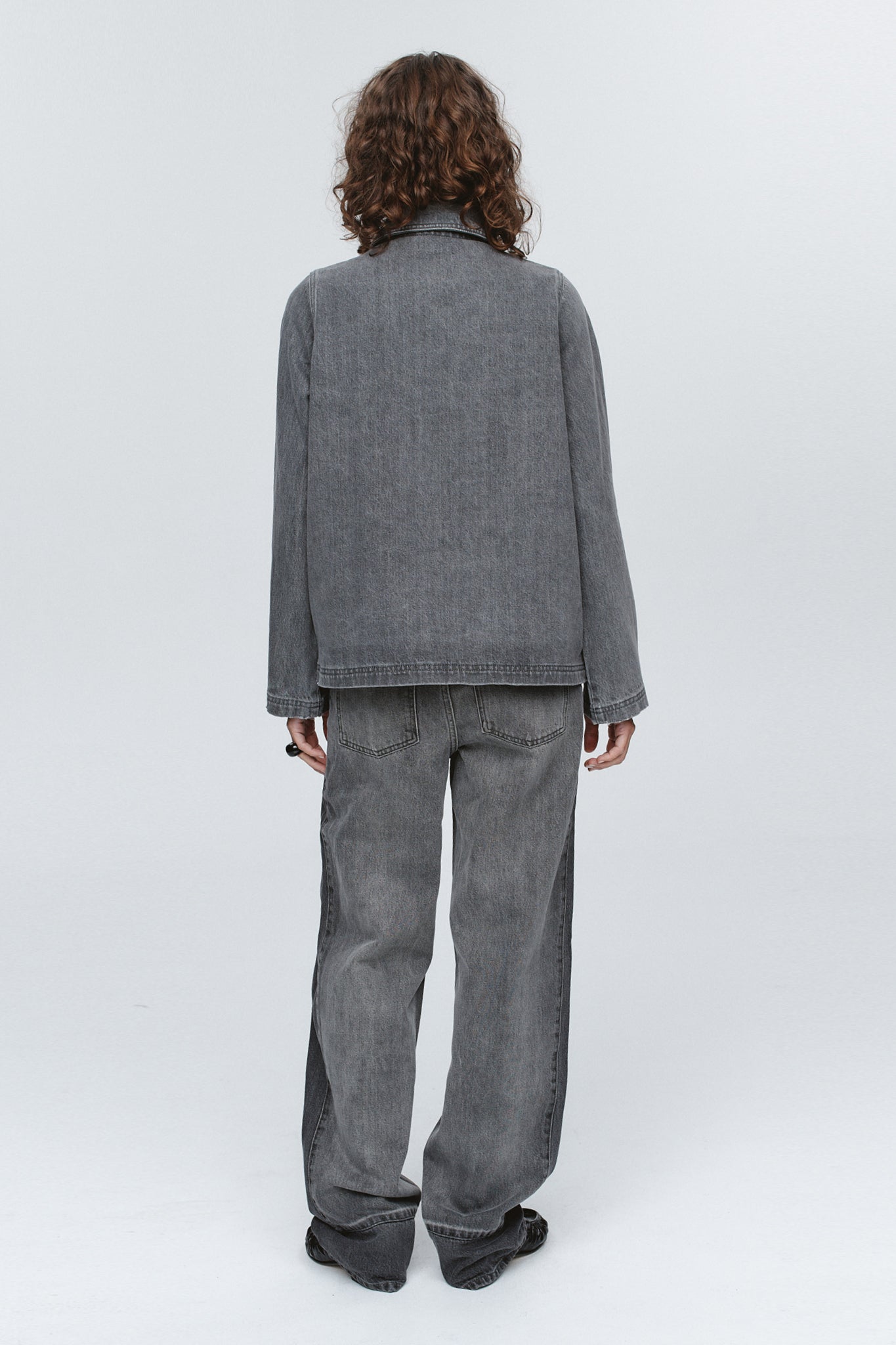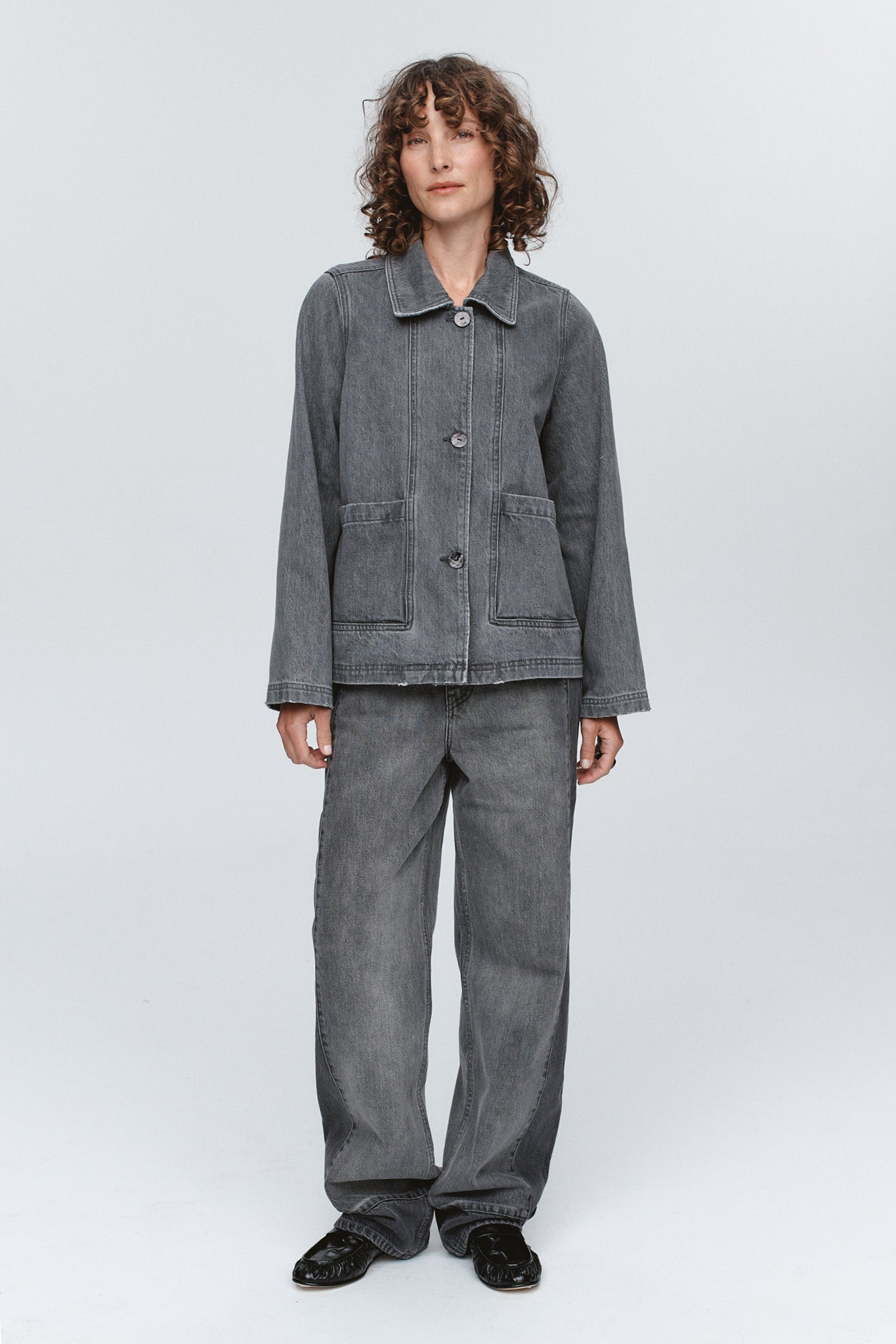A boxy-fit jacket constructed from 100% organic cotton. Designed with a slightly cropped shape and relaxed proportions. Features include a pointed collar, three-button front placket and two oversized front patch pockets. Finished with topstitching along all major seams and hems for structural reinforcement and visual definition.