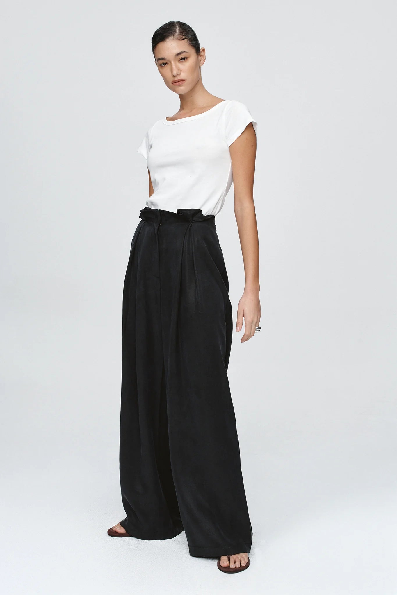 The Ismay Pant is a high-waisted, wide-leg trouser crafted from 100% lyocell, offering a soft, fluid drape with a subtle sheen. Designed with a relaxed, voluminous shape the Ismay pant features front pleats that fall from the waistband to enhance movement and shape. Discreet side pockets add functionality without disrupting the clean line. Concealed front zip with hook-and-bar fastening. The back is finished with a smooth waistband and minimal detailing.