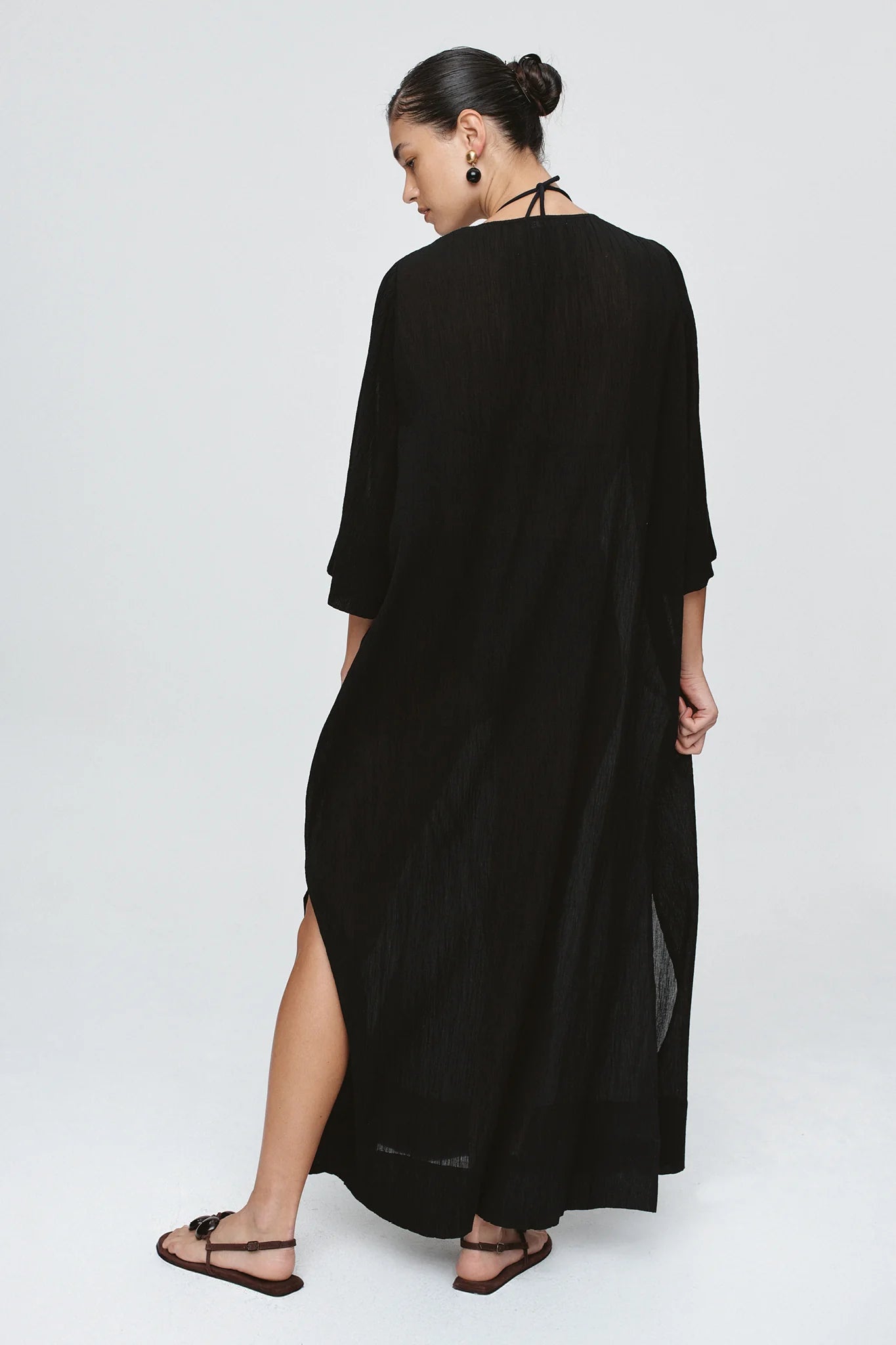A fluid kaftan cut from a 100% Cotton. A sheer fabric that moves effortlessly with the body. Designed with a clean, round neckline and a discreet front neck slit secured by a single button. A panelled hemline adds subtle weight and shape with side seam slits to create movement and soft volume. Unlined for a light, breathable feel, it is intended to layer over swimwear or fine base garments.
