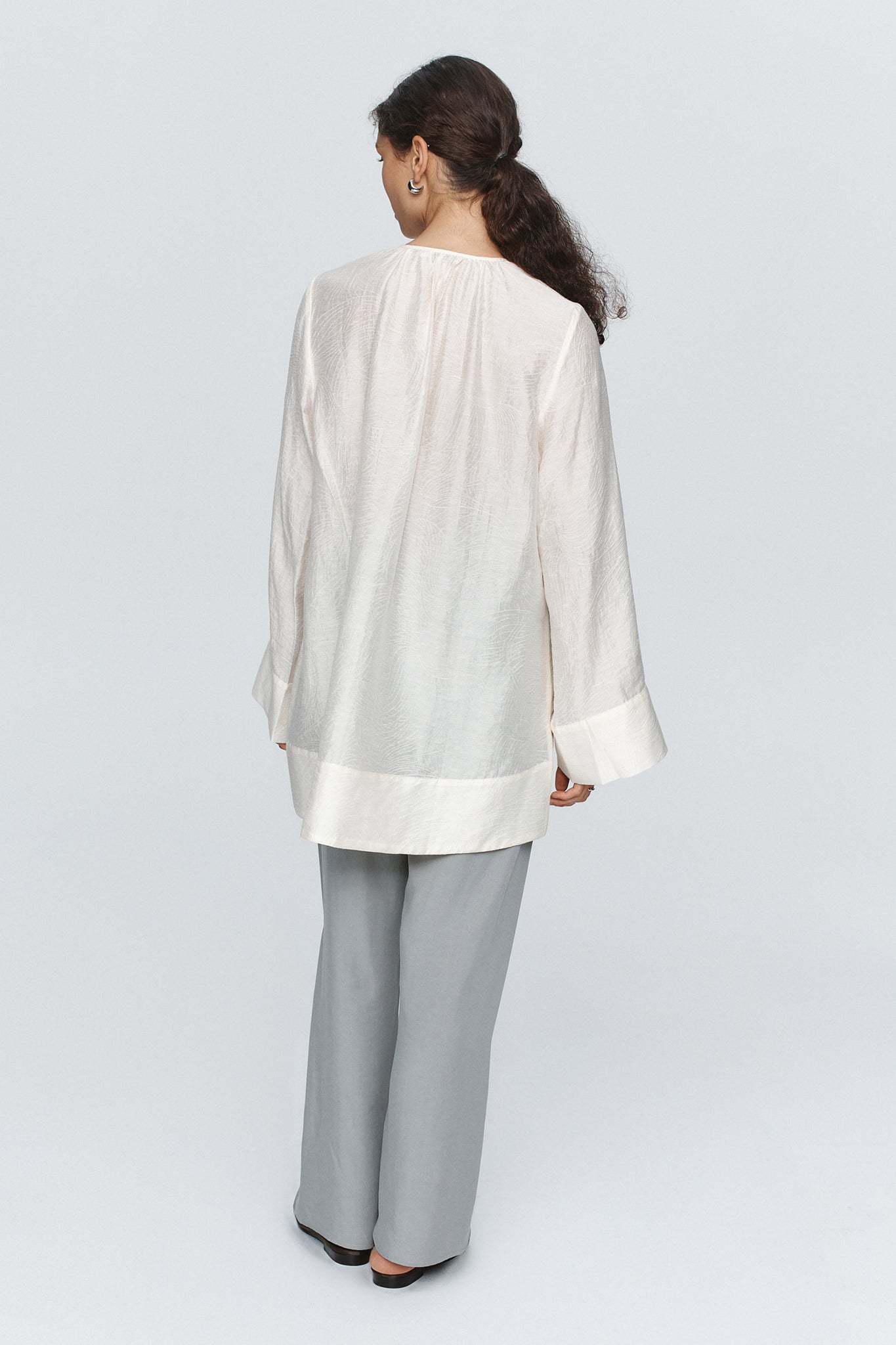 The Lottie Top has a relaxed, A-line silhouette falling to an elongated length that is slightly longer at the back. This top has long-sleeves that subtly widen and are finished with an exaggerated cuff. This top features a deep V-neckline, with gathers that accentuate the relaxed shape. This version of the Lottie Top is crafted in a light-weight cloth that is a unique combination of linen, silk and tencel. This top has a slight sheerness and is finished with a subtle botanical pattern.