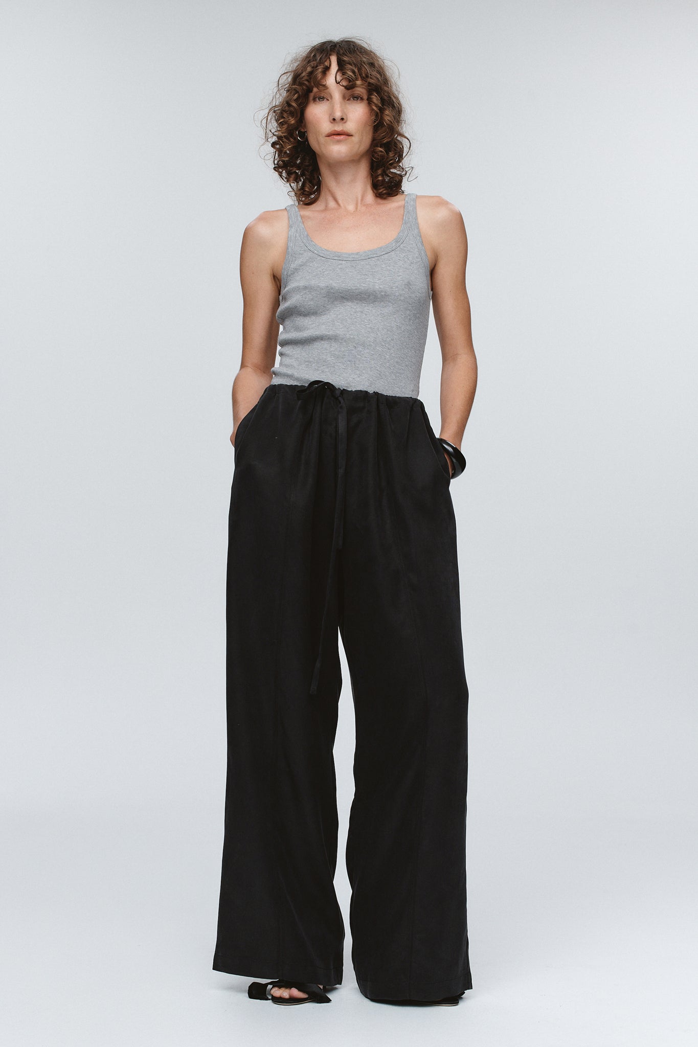 This relaxed, full-length pant sits on a fixed waistband with a channel and drawstring closure that can be adjusted for the perfect fit. This pant features a wide leg, finished with a seam detail down the front and pockets at the side.