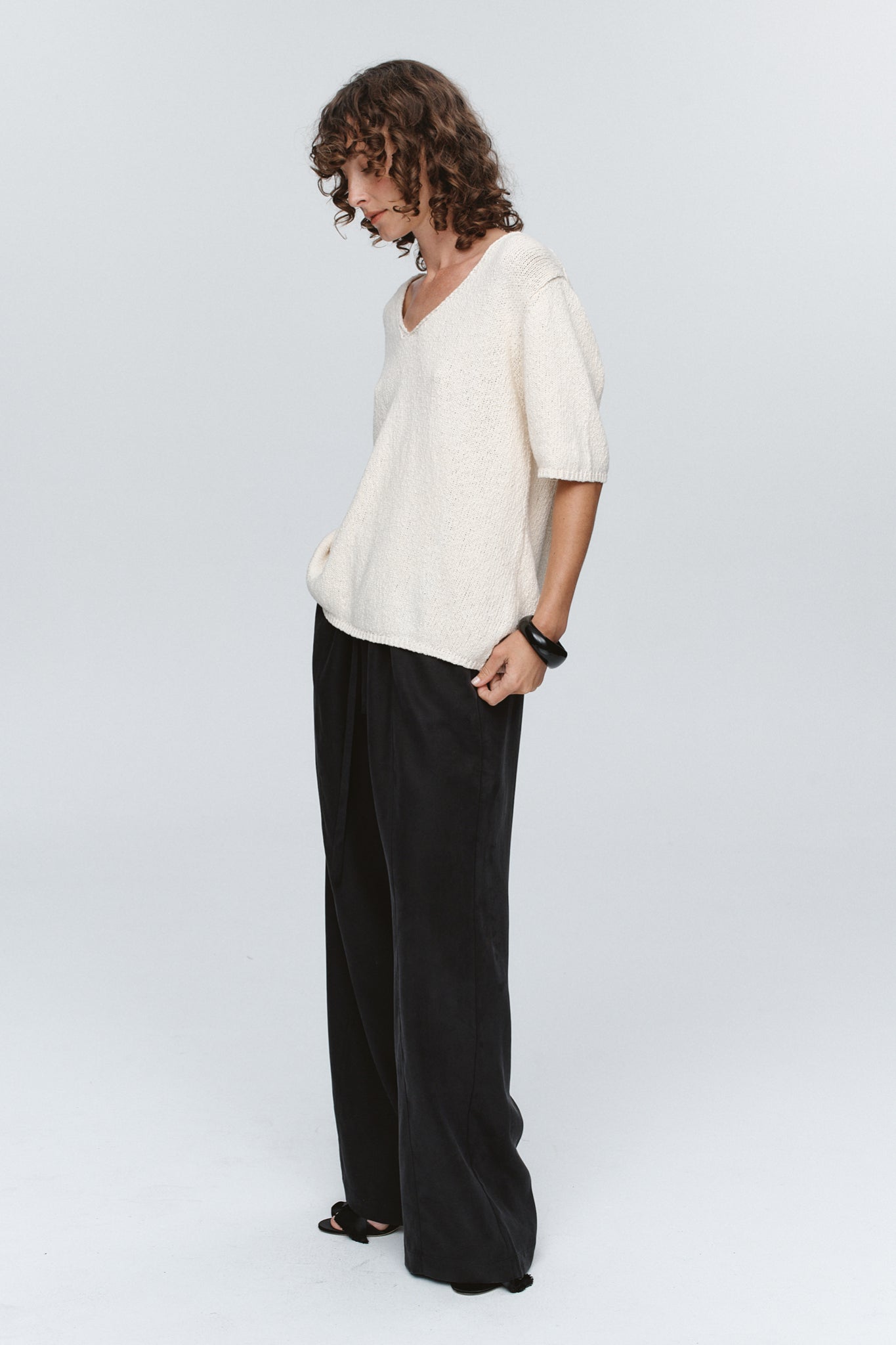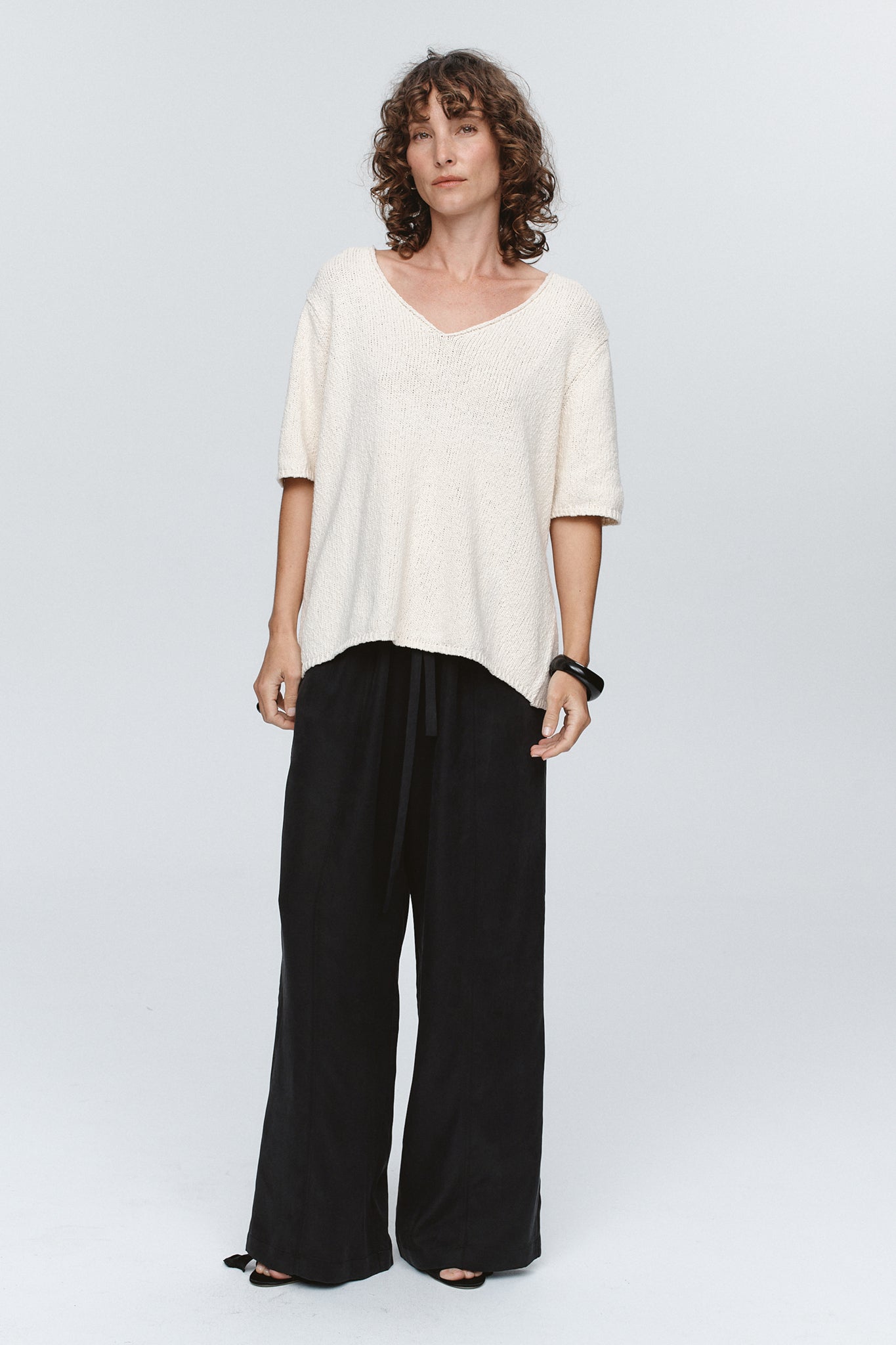 The Nya Tee offers an elevated take on everyday knitwear, crafted in a tactile, lightweight 100% Cotton. Its relaxed t-shirt shape features a wide V-neckline, short sleeves and softly ribbed edges, lending an effortless drape and understated texture.