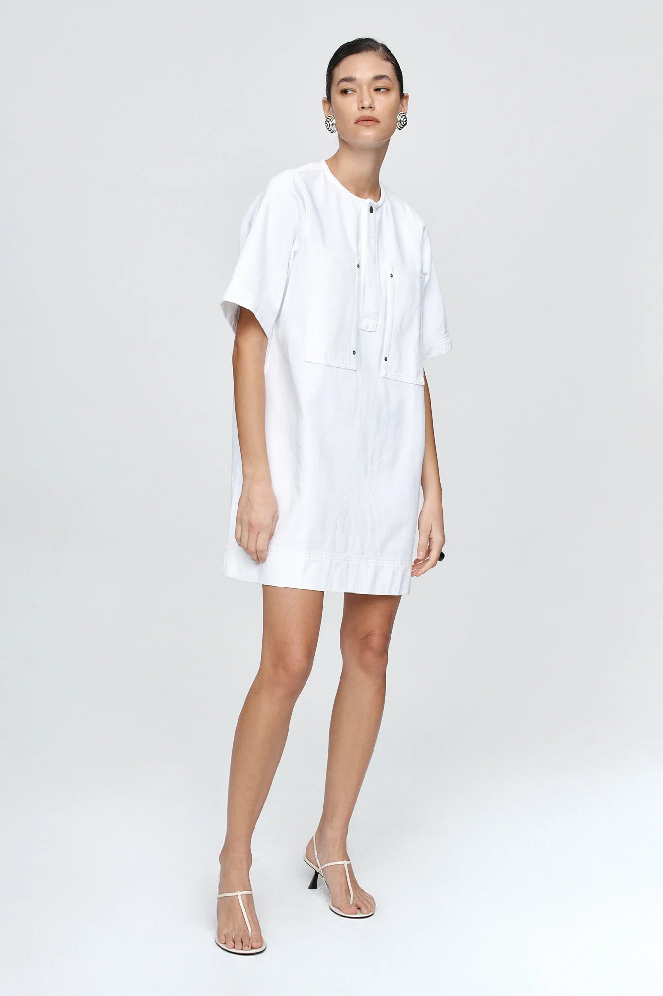 A short-sleeve dress constructed from 100% organic cotton with a relaxed, boxy shape. Features a round neckline and a concealed half placket secured with snap dome closures. Features include two oversized chest patch pockets with metal rivet reinforcement. Finished with topstitching and exaggerated hem detailing for a utility-inspired finish.