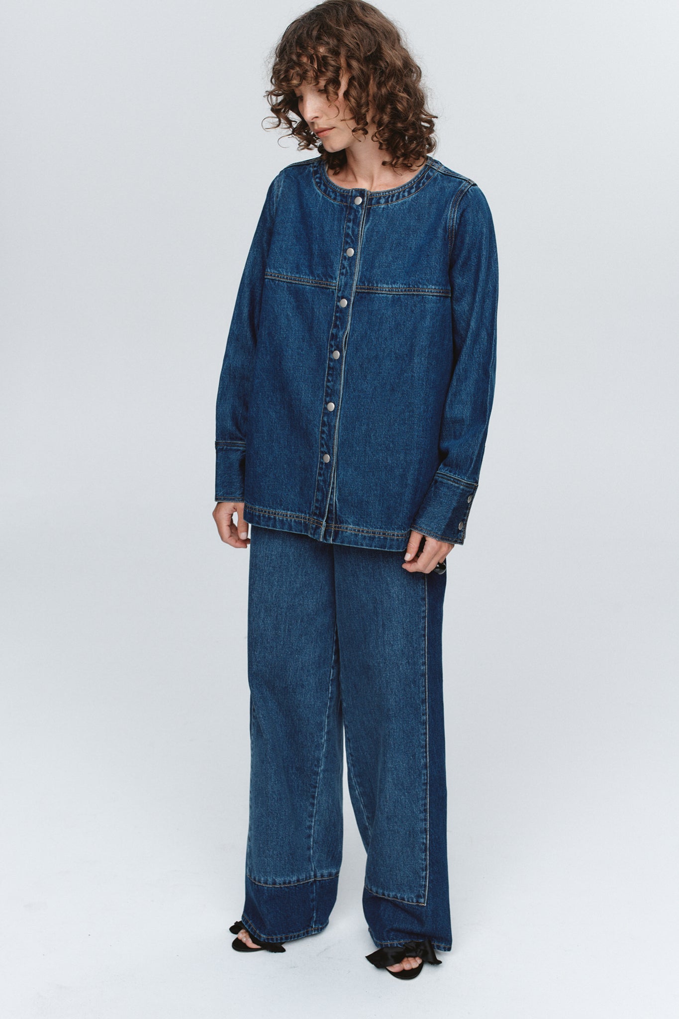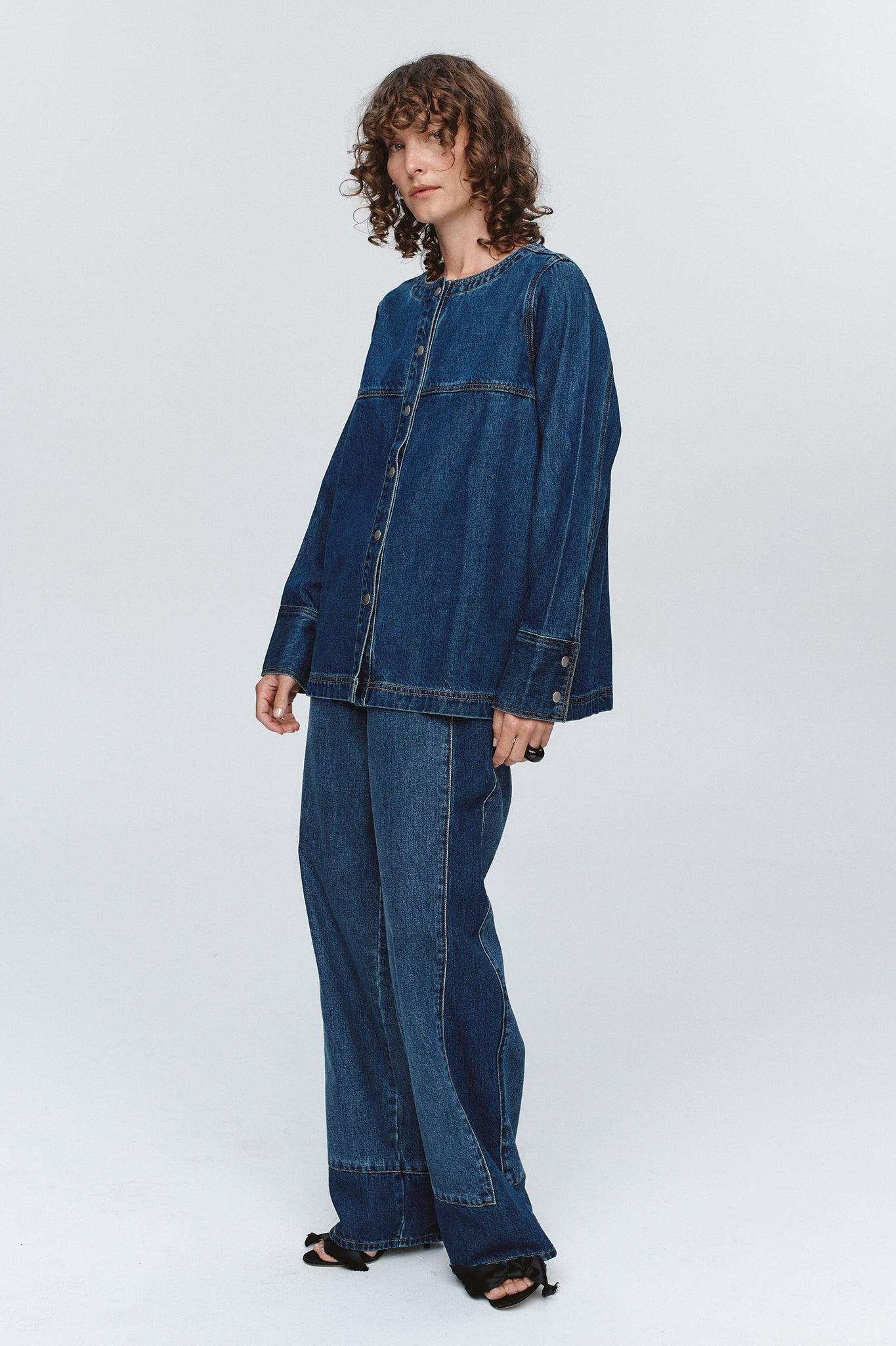 A long-sleeve shirt constructed from 100% organic cotton. Features a clean, collarless round neckline and front placket secured with snap dome fastenings. Designed with exposed panel seams and reinforced topstitching throughout. Wide sleeve cuffs are finished with double snap closures and topstitch detailing for structural emphasis.