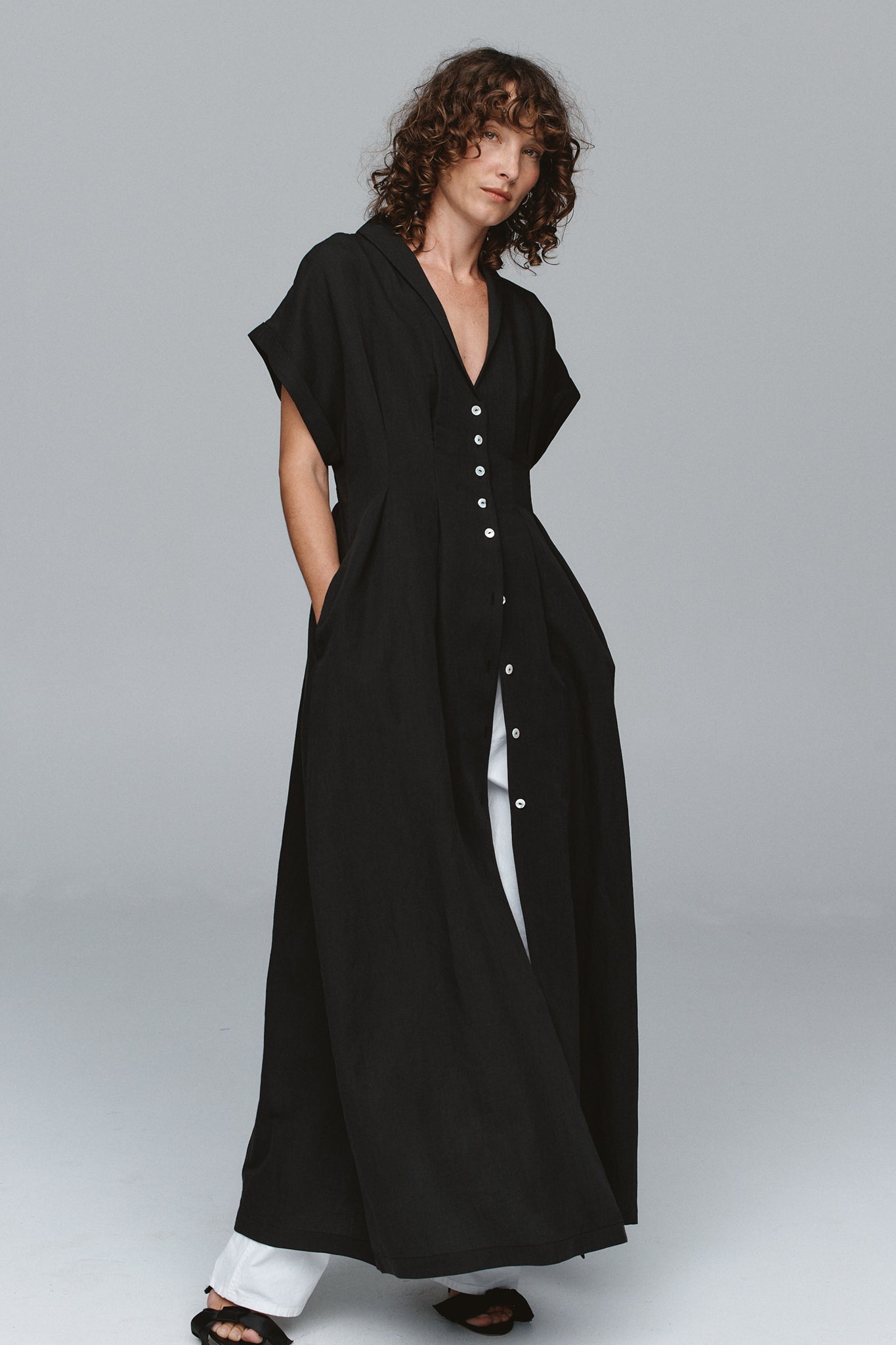 A full-length dress constructed from a linen / cotton cloth. Features a clean, collarless neckline, wide short sleeves, and a full button-through front closure. Includes side seam pockets for functionality and pleat detailing at the front for controlled volume and ease of movement. Designed for a relaxed fit that drapes from the shoulder.