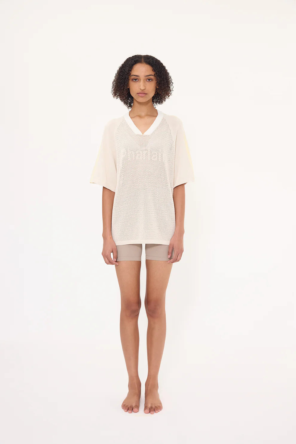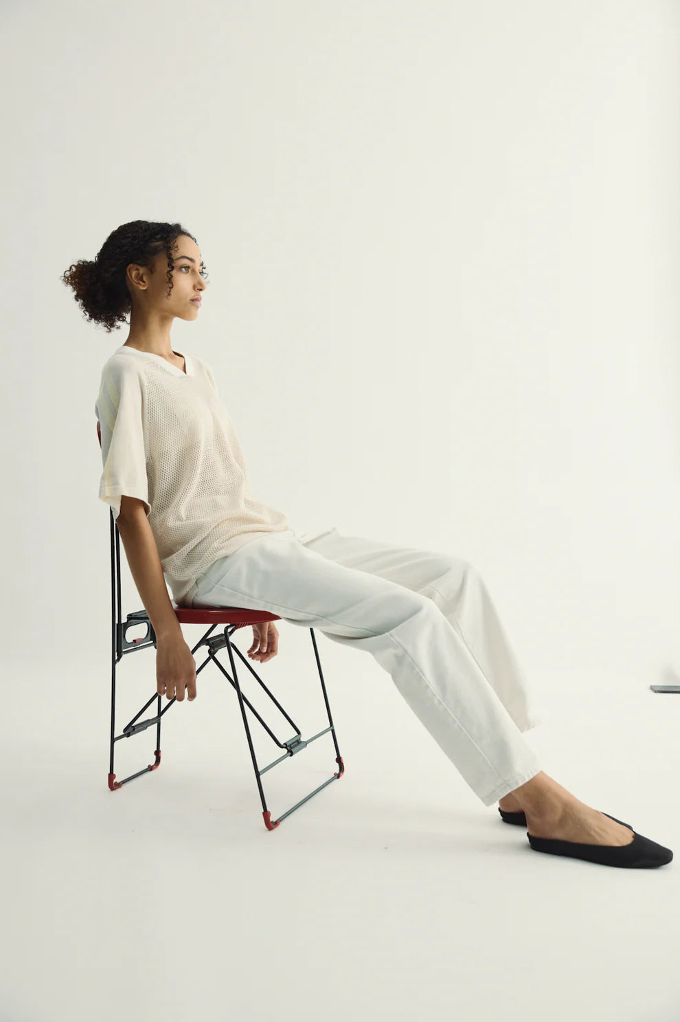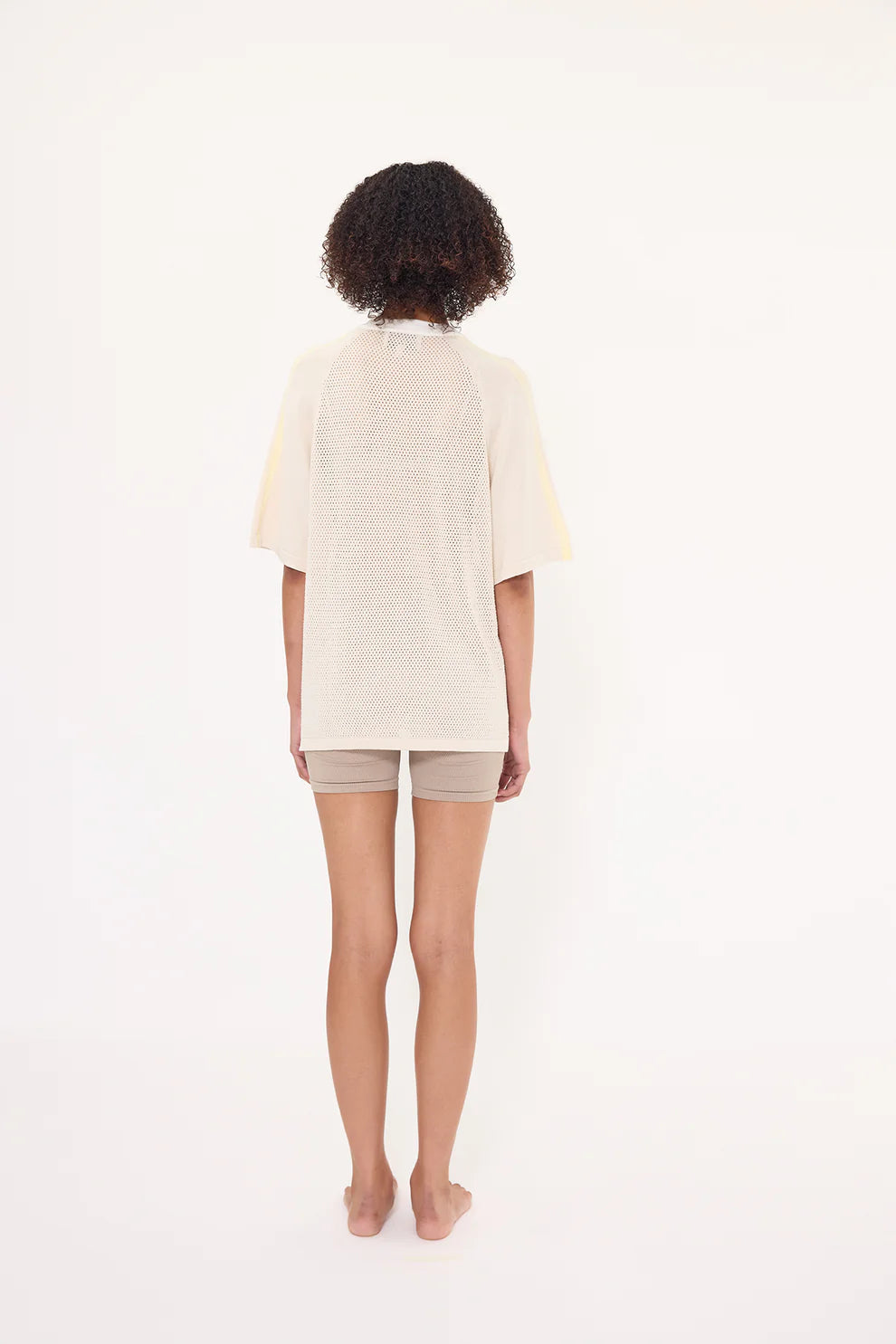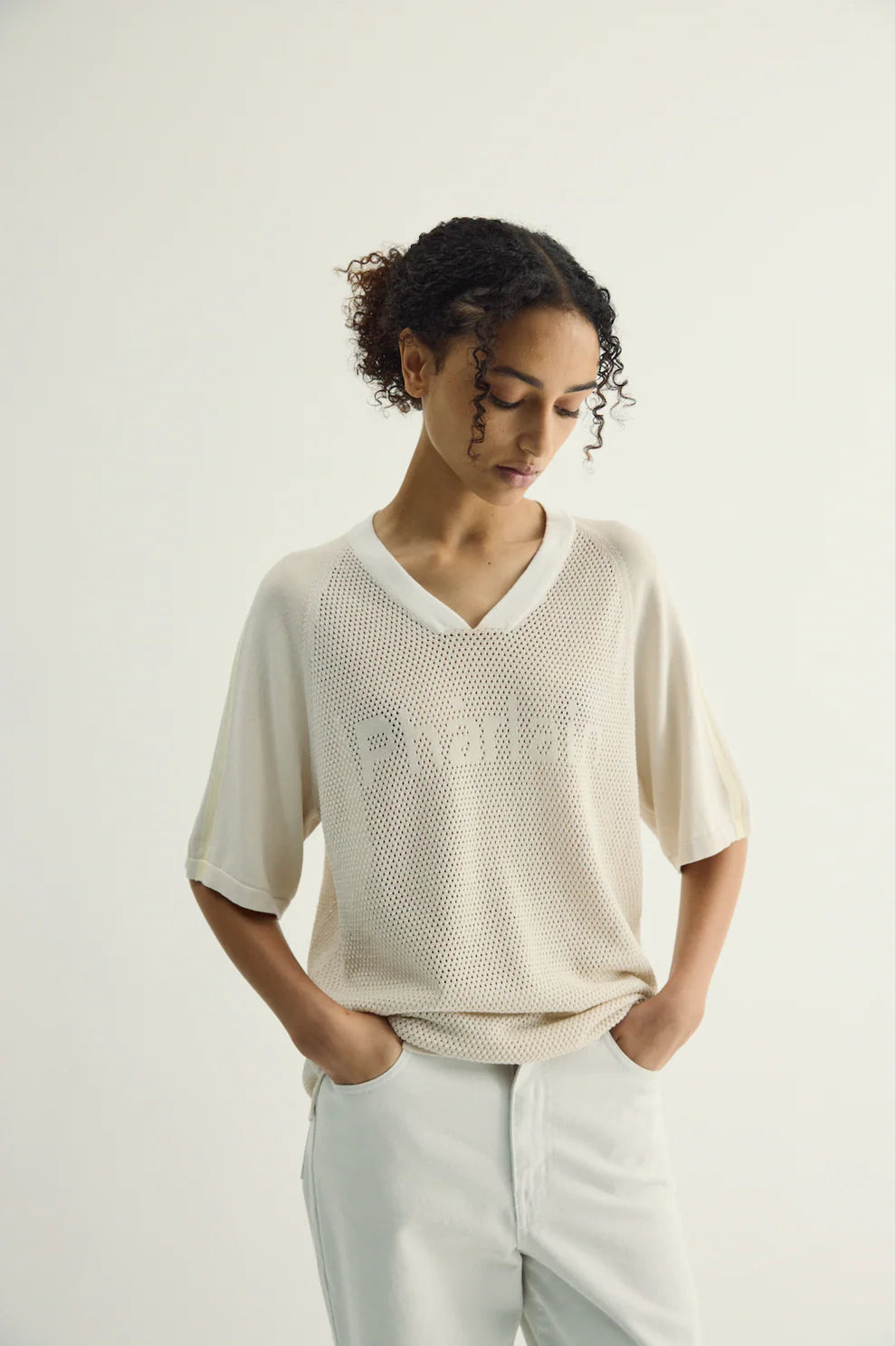 The Game Top gives a subtle nod to classic sporting style. Knitted in lightweight mercerised cotton, its body features a summer-ready eyelet stitch, while plain sleeves are finished with contrast stripes. The Phàrlain name is knitted into the front as a graphic detail.
