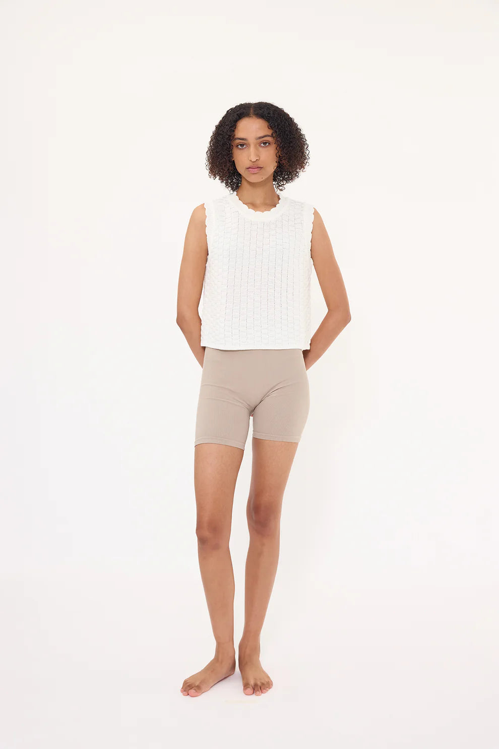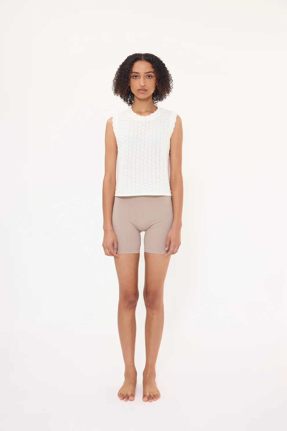 The Ruth Top is knitted from soft mercerised cotton with an all-over textured square pattern. The neckline and shoulders are edged in a lace-inspired stitch, adding a feminine touch to this easy-wear piece.