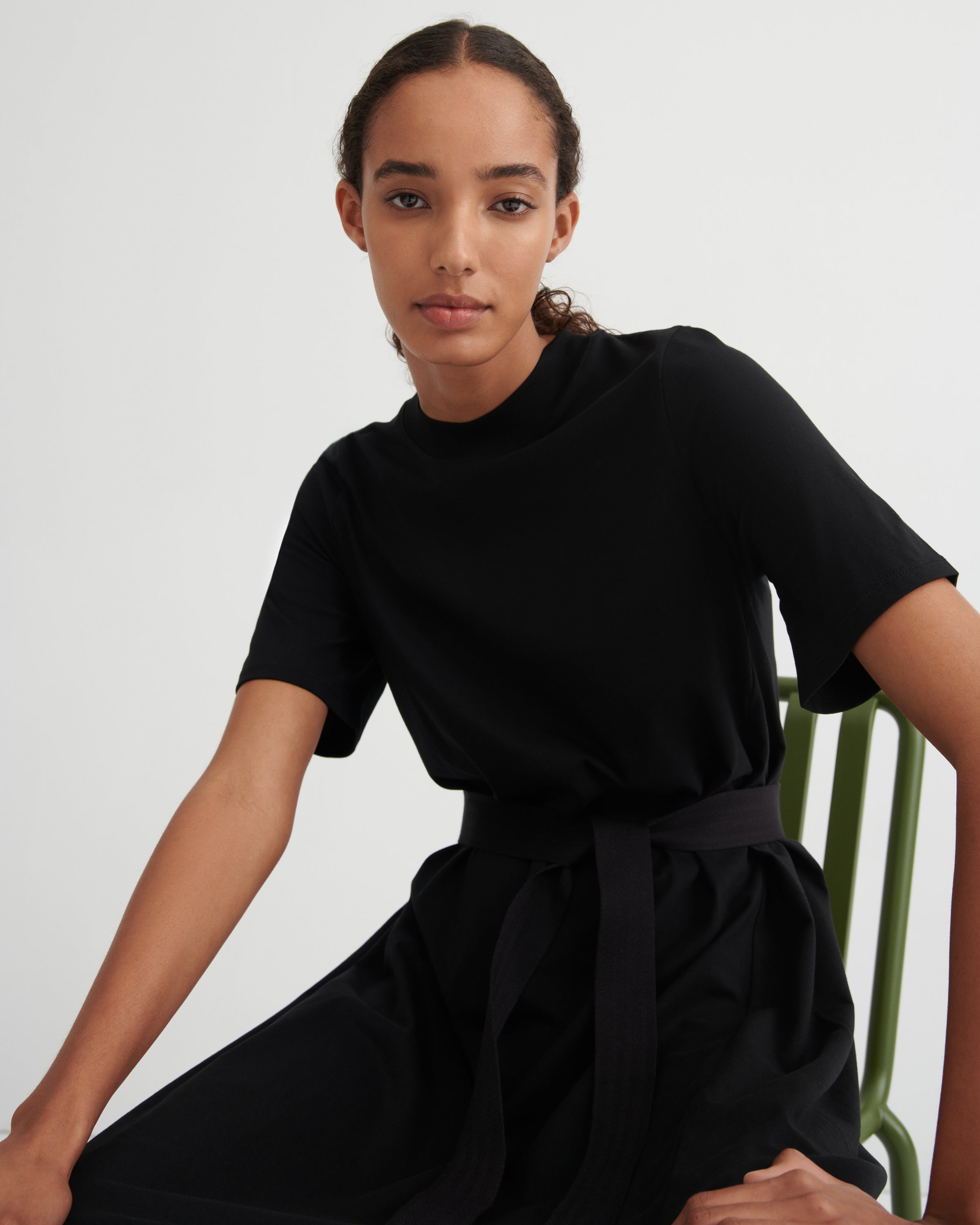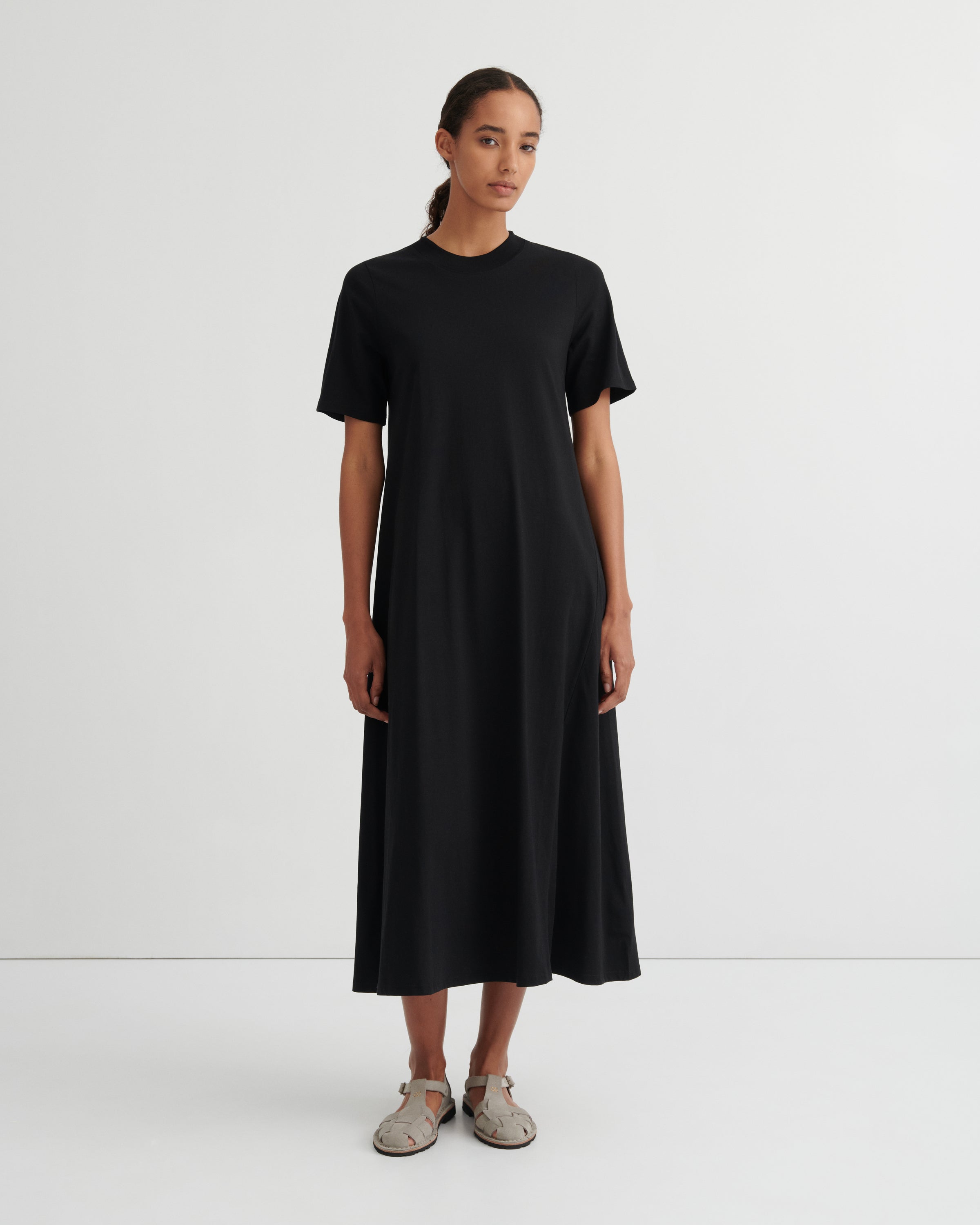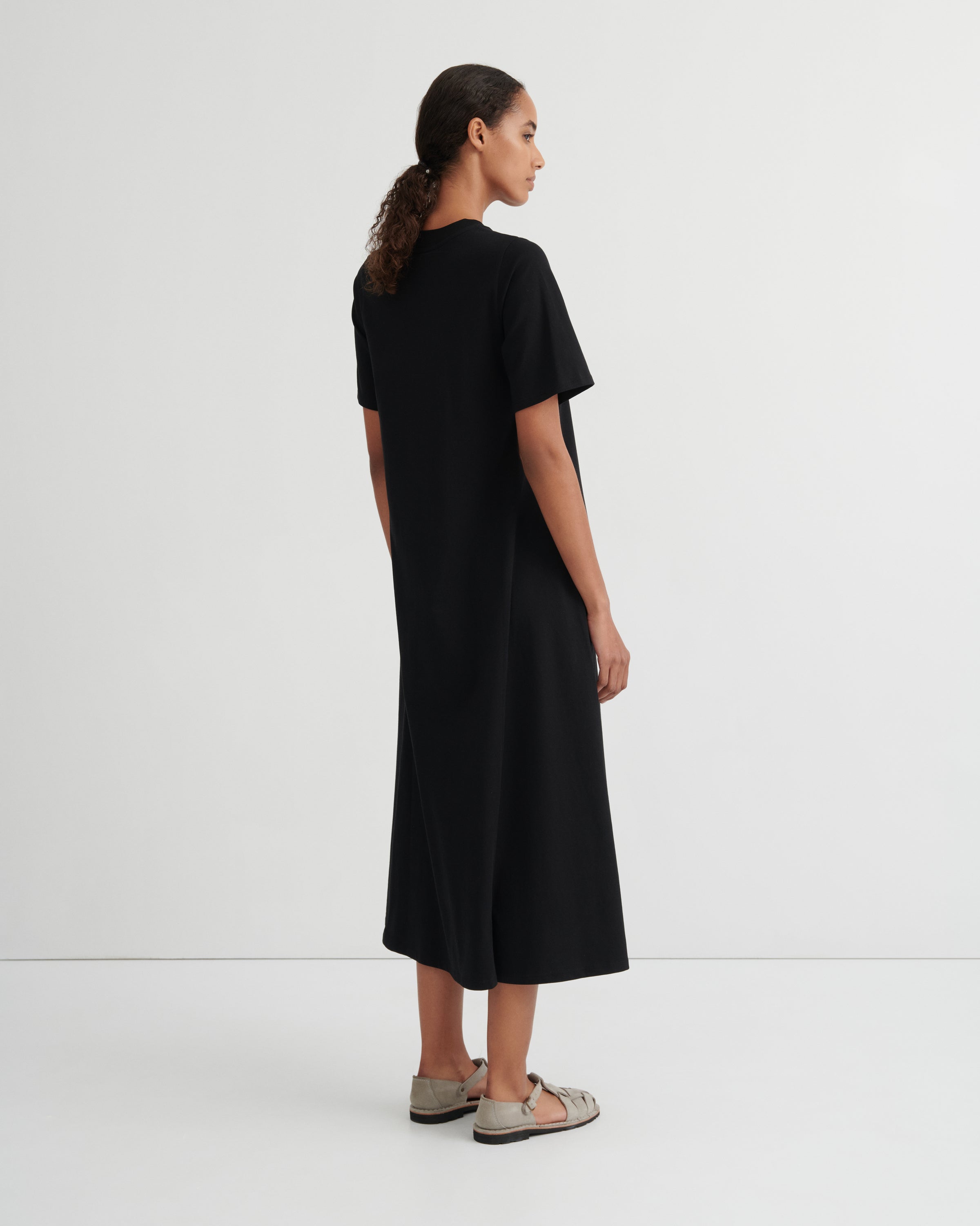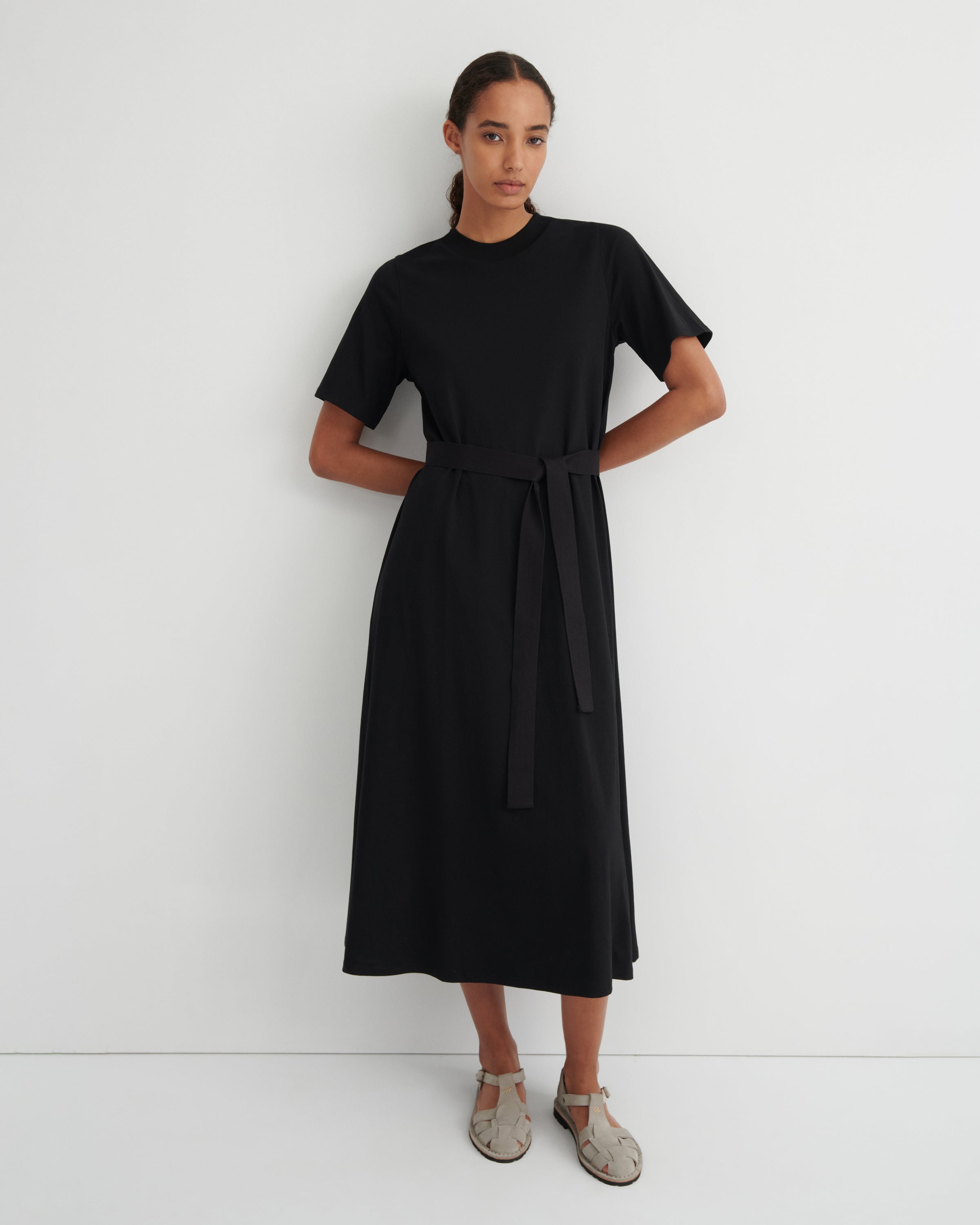 A perfect everyday staple, the T-Shirt Swing Dress is a full length, a-line dress with a wide ribbed neck. It features our signature twisted side seams and a removable, woven belt for added versatility. Crafted from midweight organic cotton jersey. All Fairtrade organic cotton. All plastic-free.
