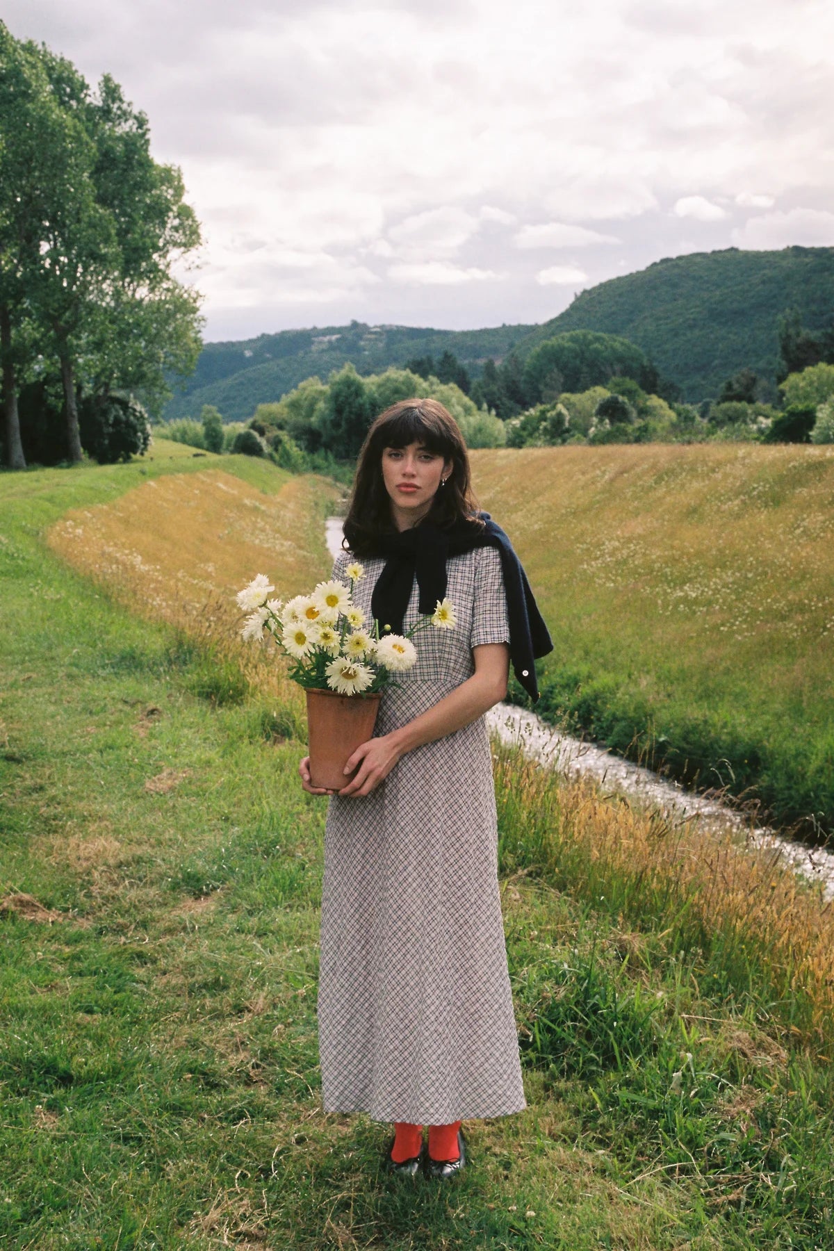 Simple and chic, the Universal dress features short sleeves, a simple bodice, long bias-cut skirt, and waist ties.